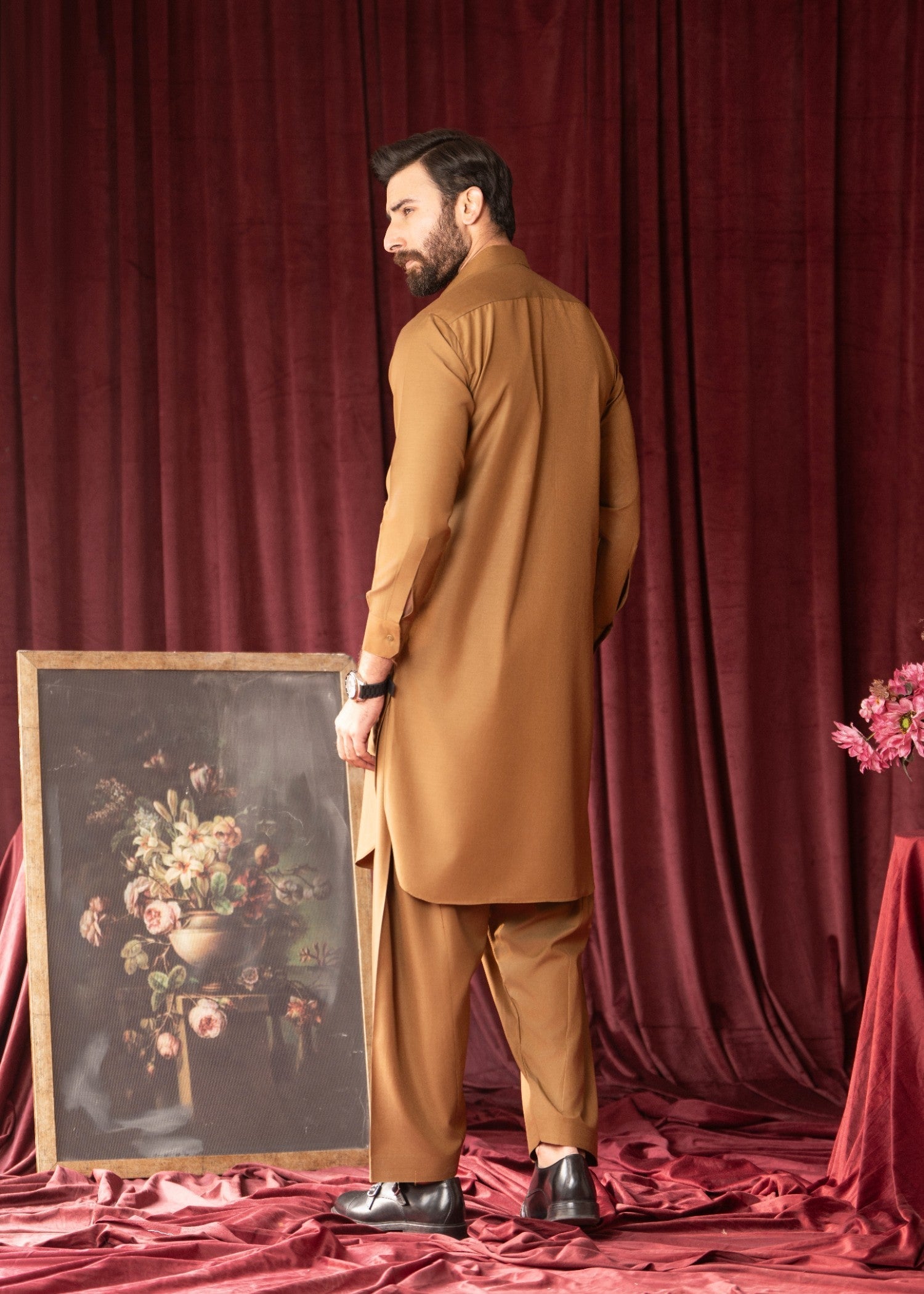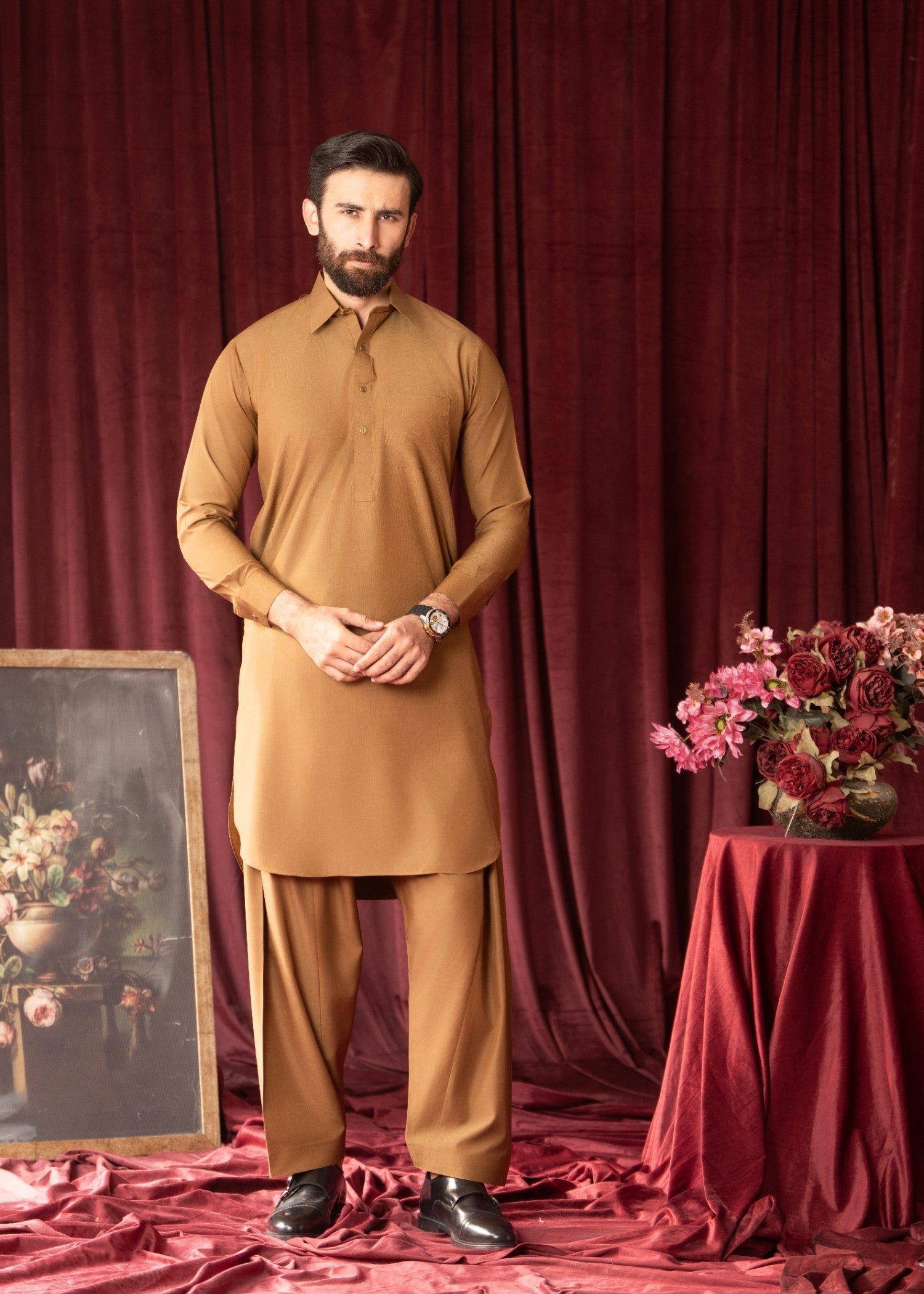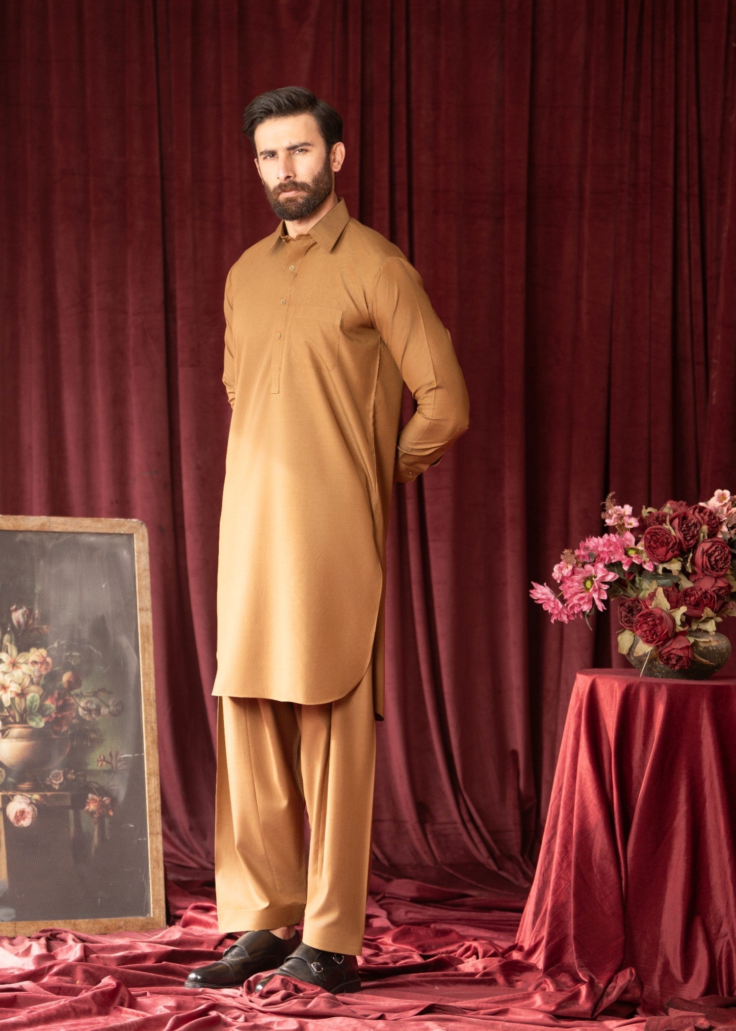 Camel brown wash-and-wear shalwar kameez featuring a straight-cut top and straight-leg bottom ideal for daily wear, all-season comfort, and effortlessly stylish modern traditional menswear.