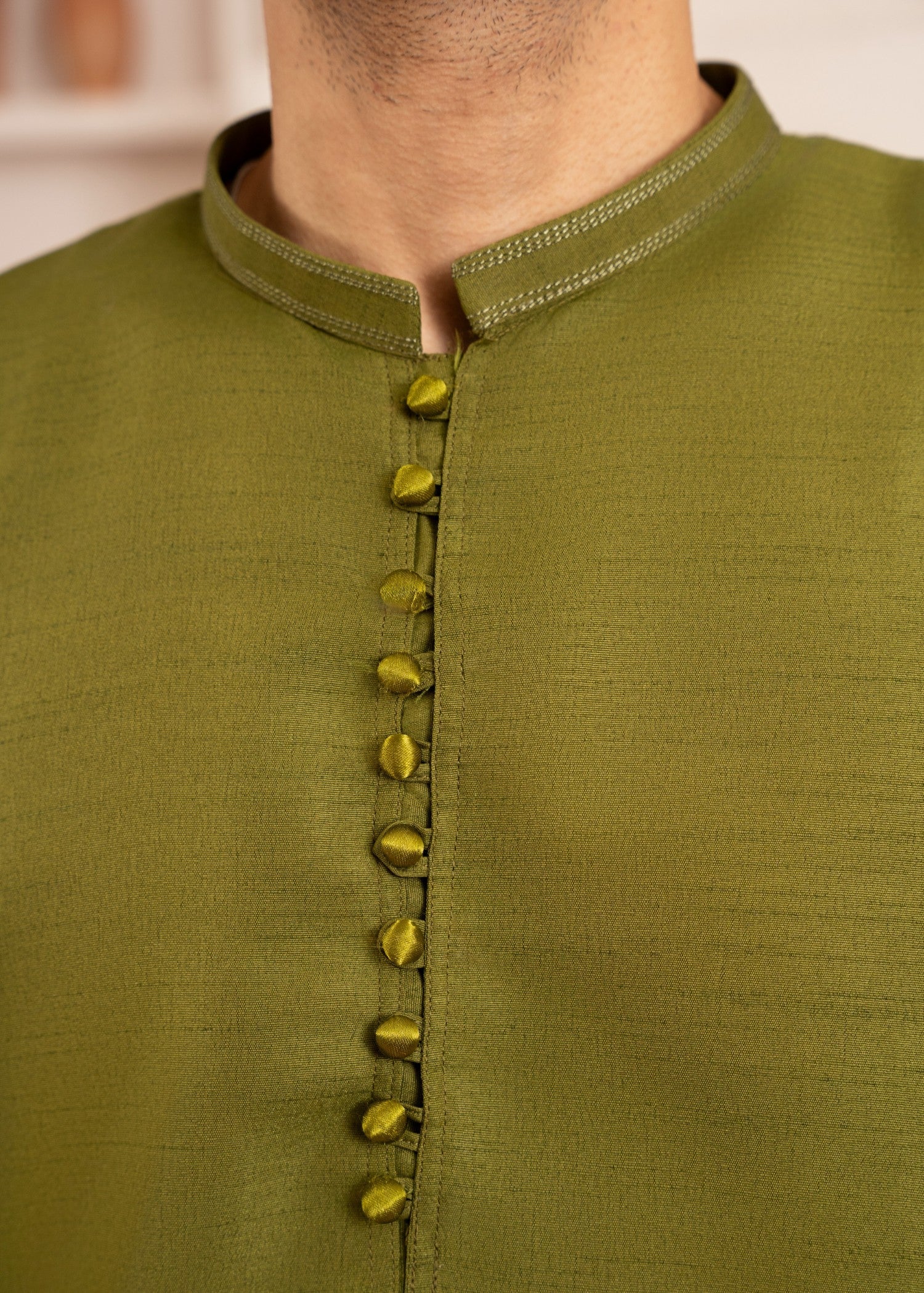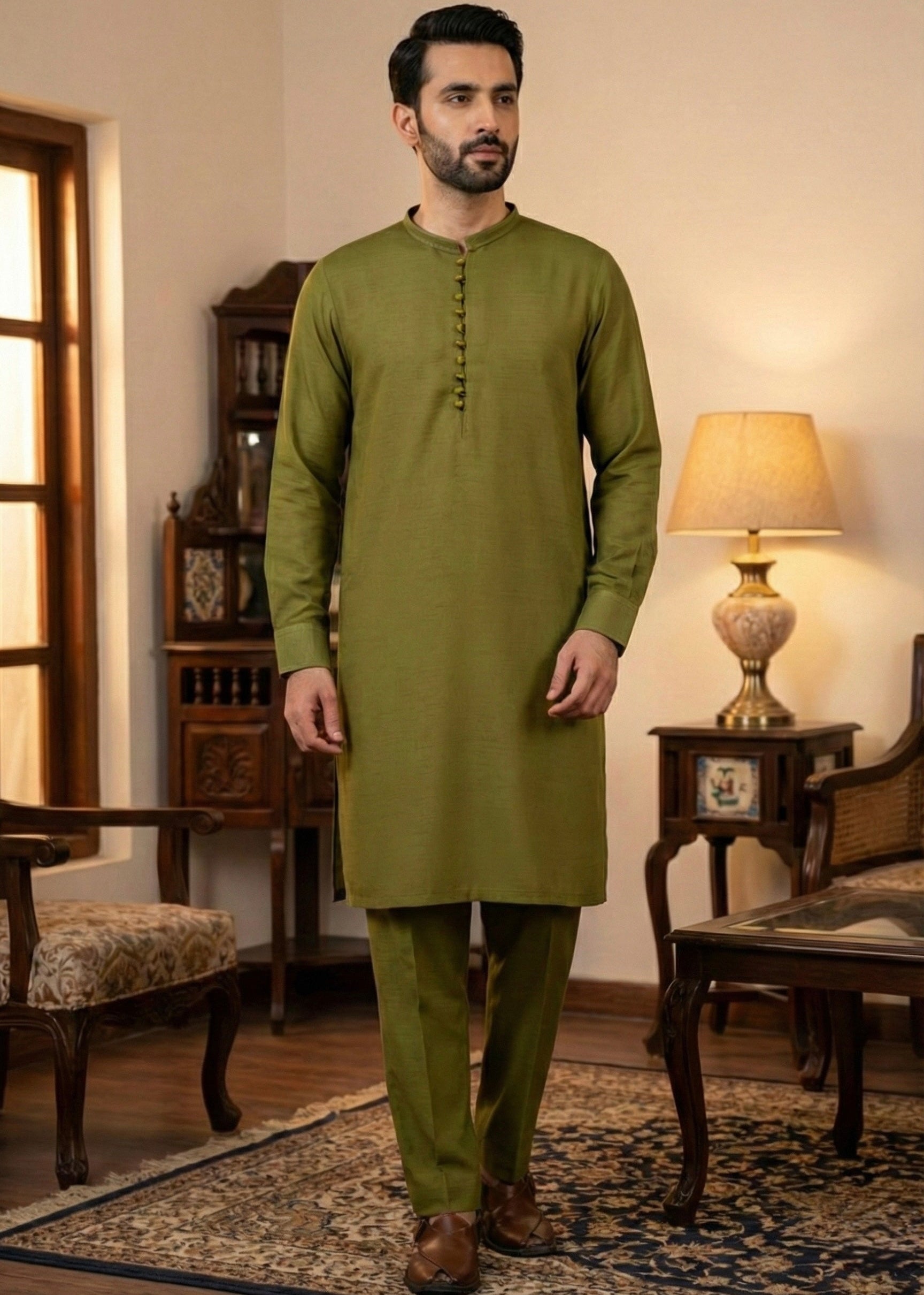 Olive green raw silk kurta set with a straight-cut top and straight trouser bottom—perfect for festive occasions, parties, and all-season elegant traditional menswear styling.