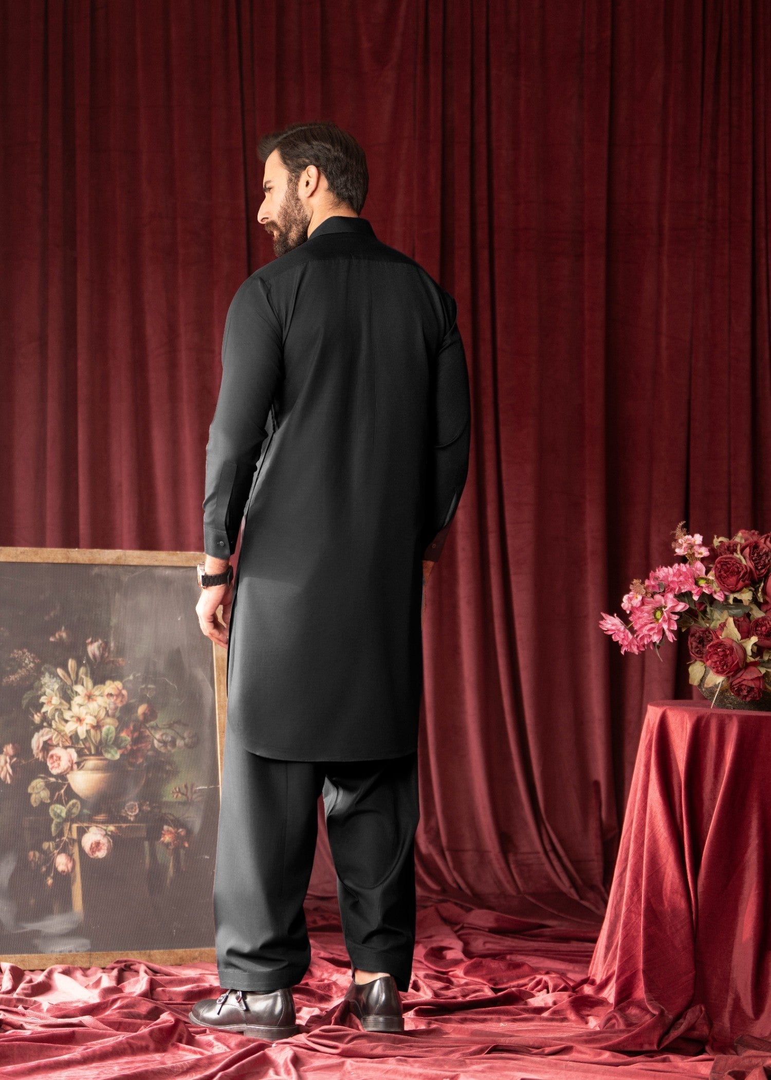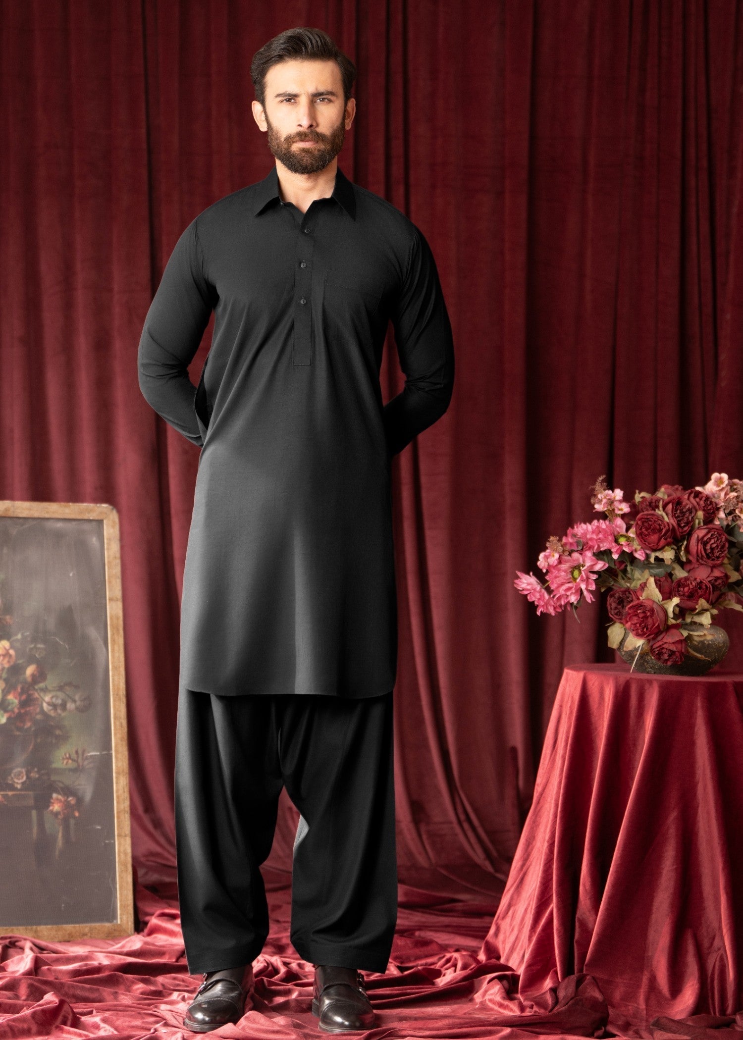 Black shalwar kameez in premium wash-and-wear fabric, featuring a straight-cut top and straight-leg bottom—perfect for daily wear, all-season comfort, and effortless modern traditional menswear style.