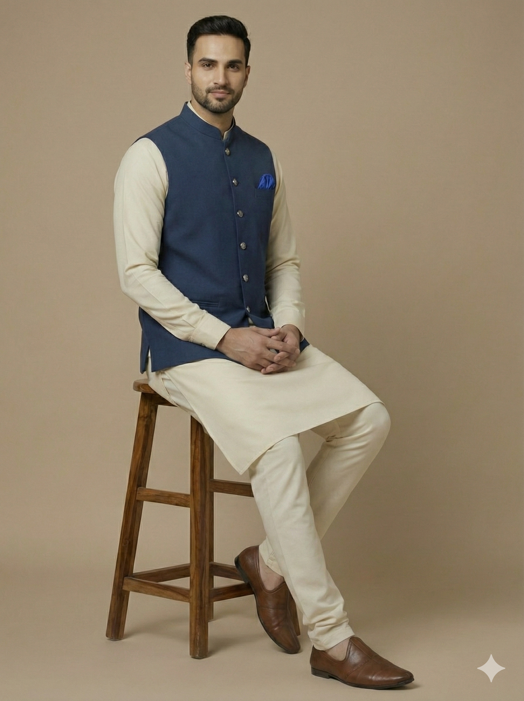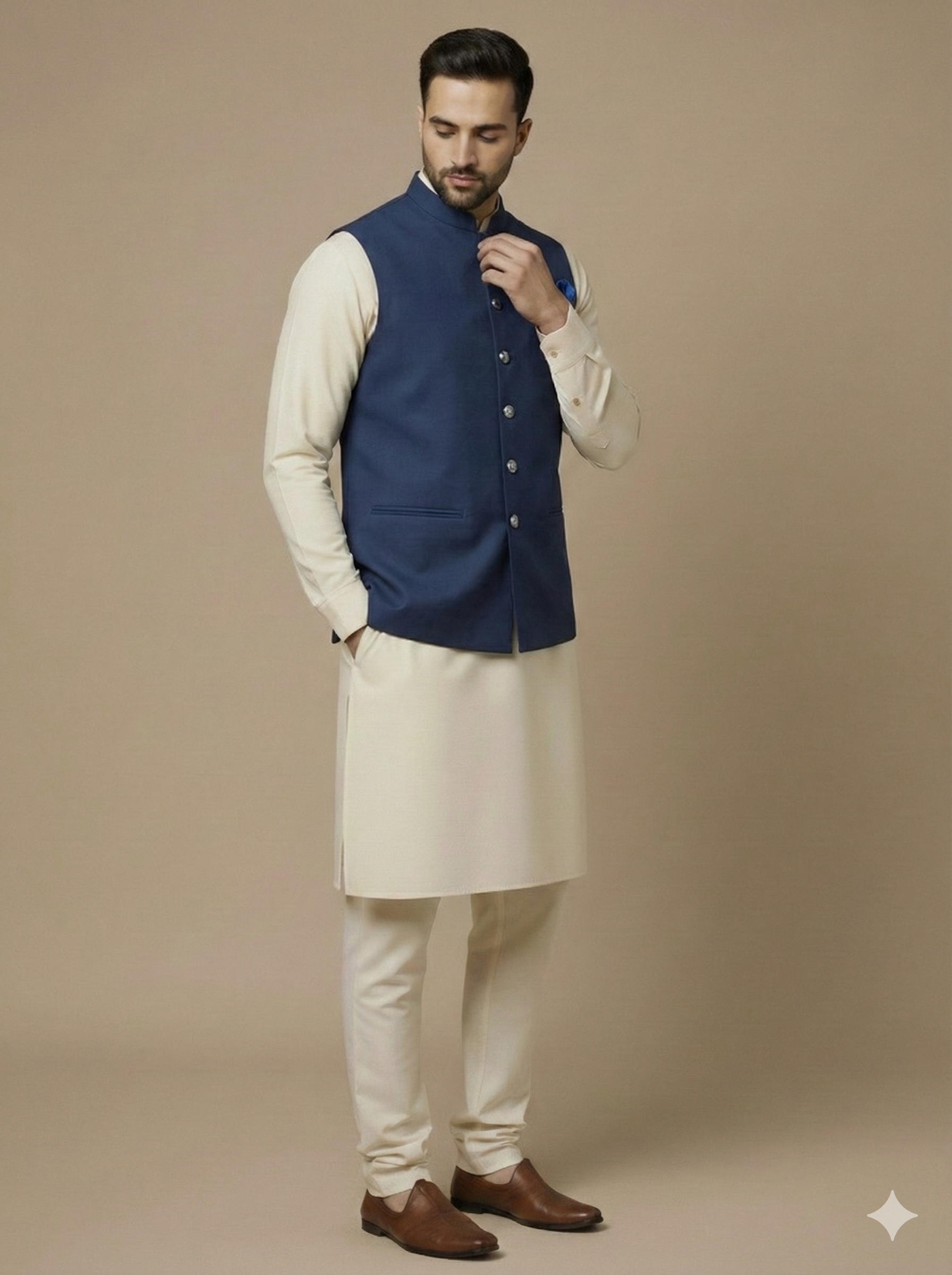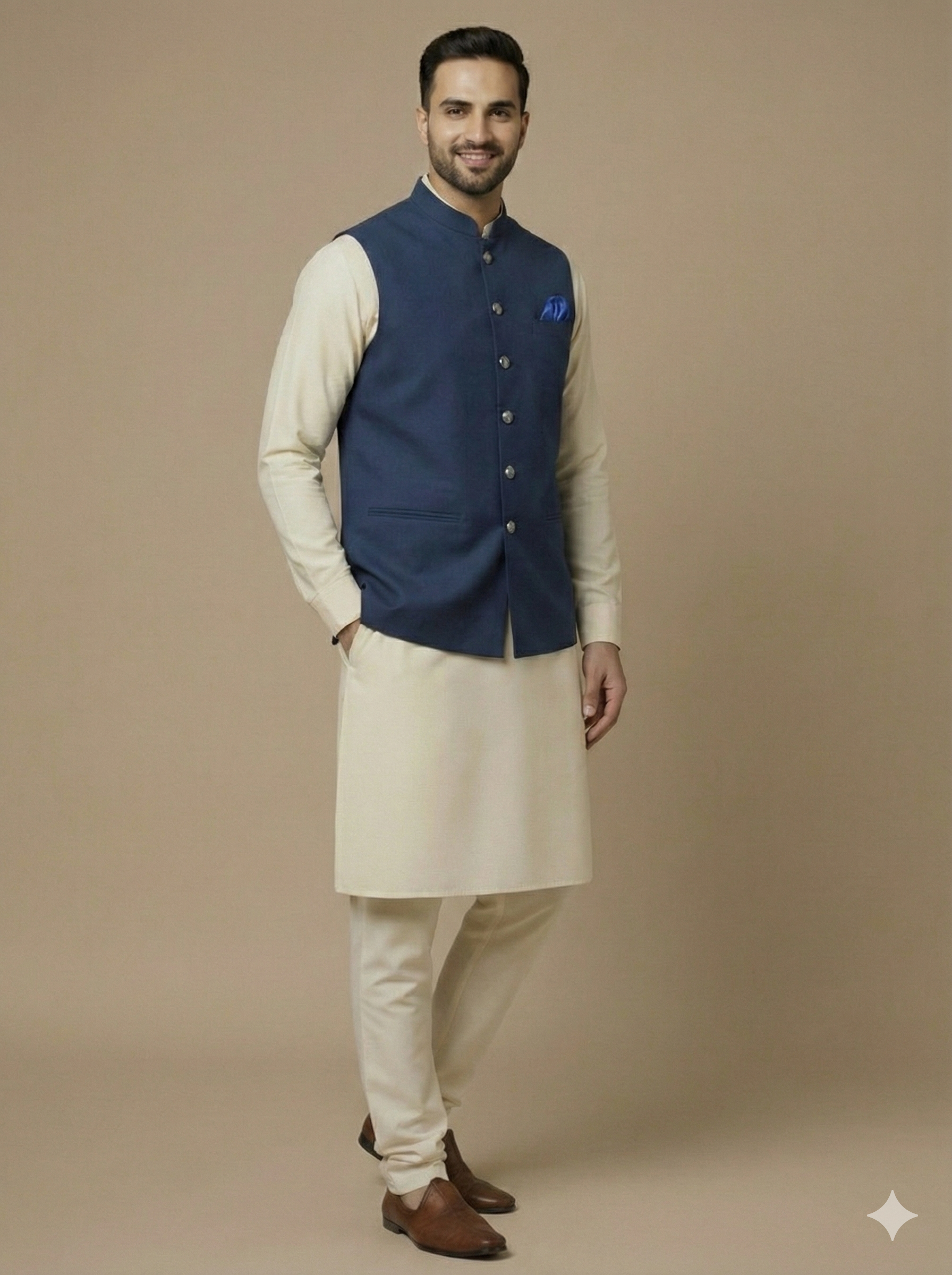 Upgrade your classic look with this blue plain waistcoat, tailored in premium fabric with a refined fit—ideal for weddings, festive occasions, office wear, and sophisticated daily menswear styling.