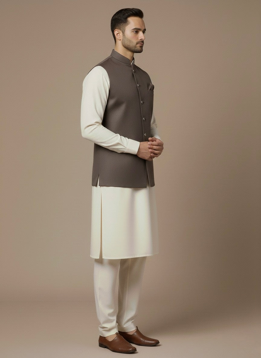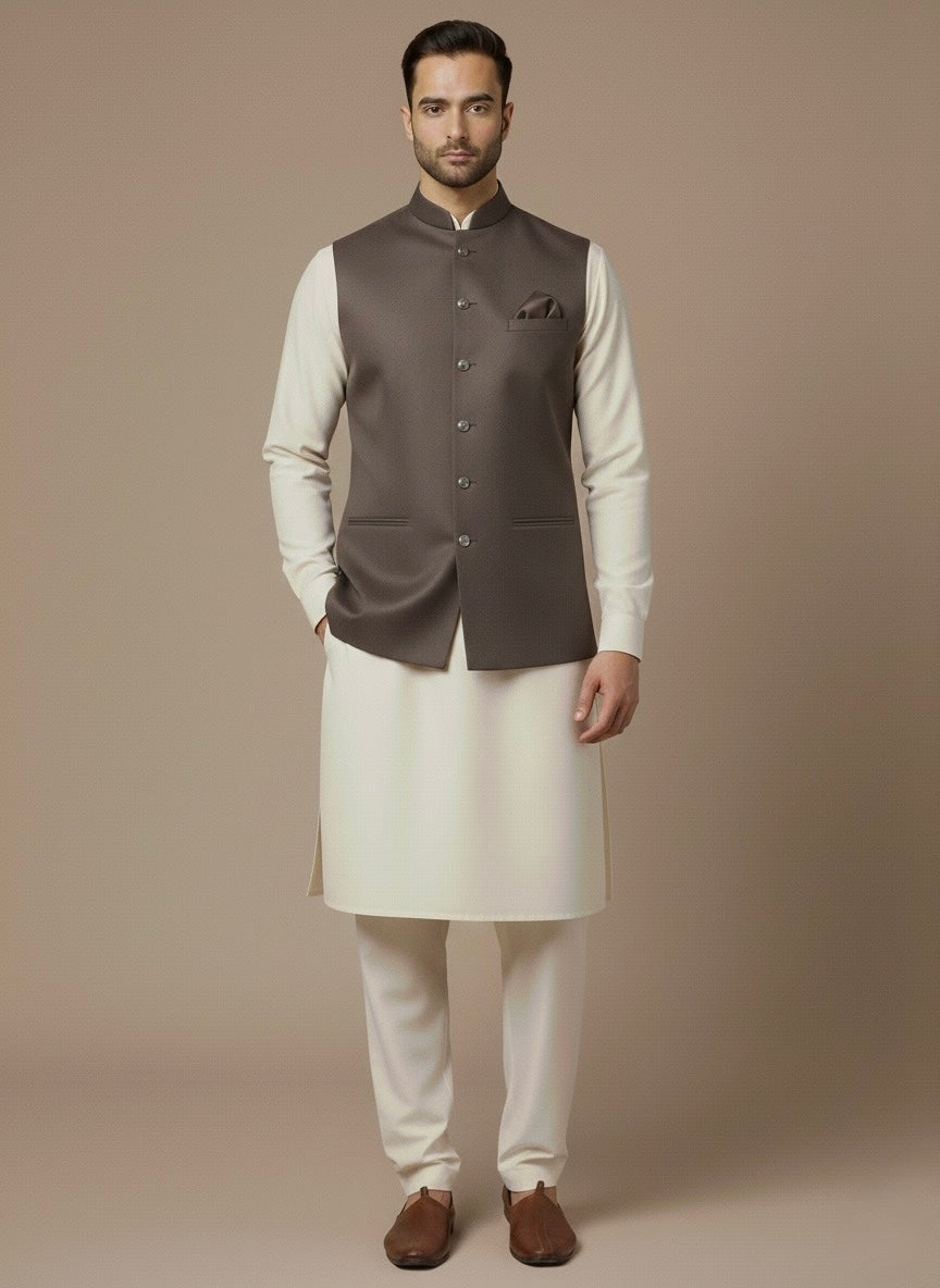 Upgrade your wardrobe with this taupe plain waistcoat, tailored in premium fabric with a sleek fit—perfect for weddings, festive occasions, office wear, and refined modern menswear styling.