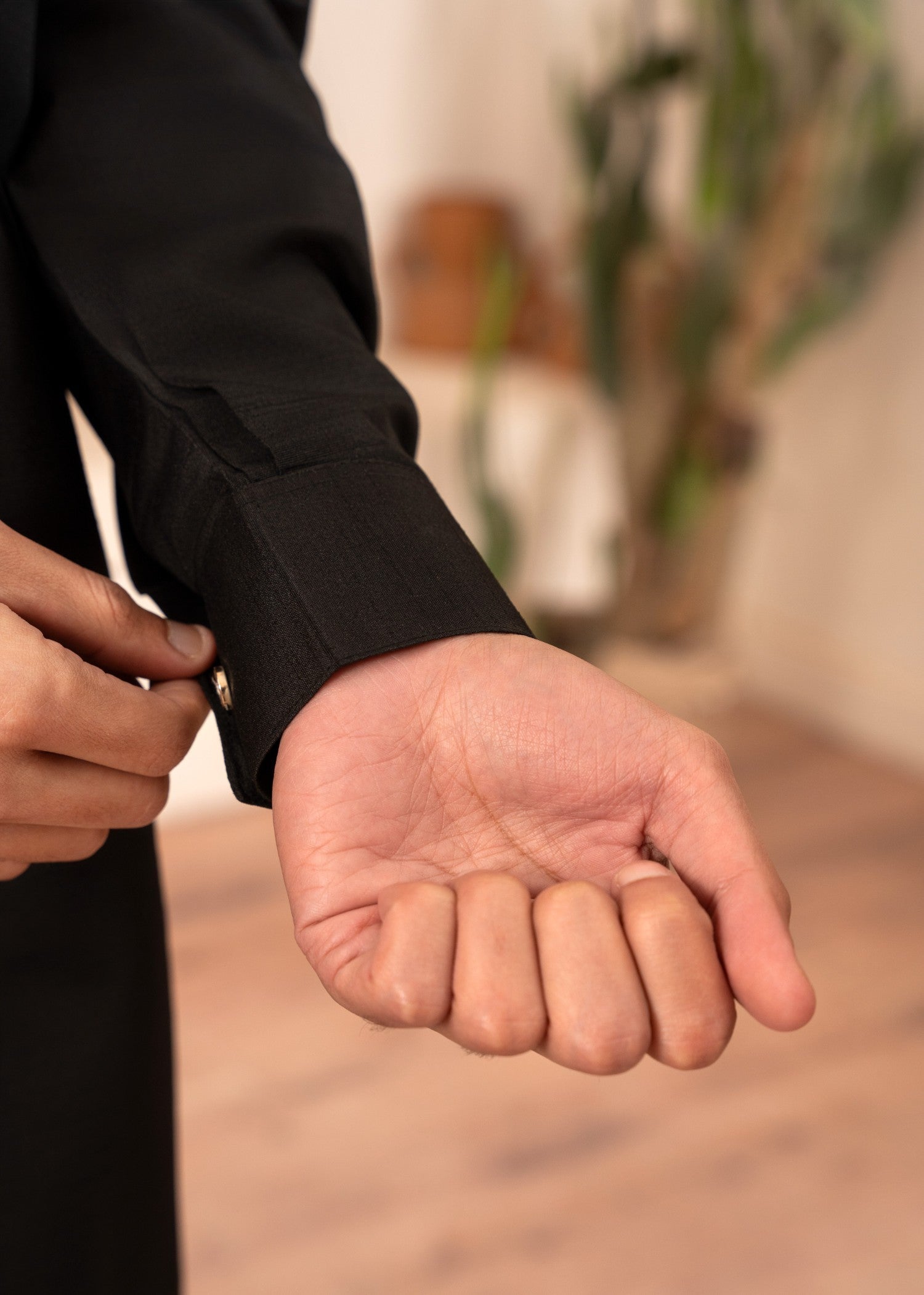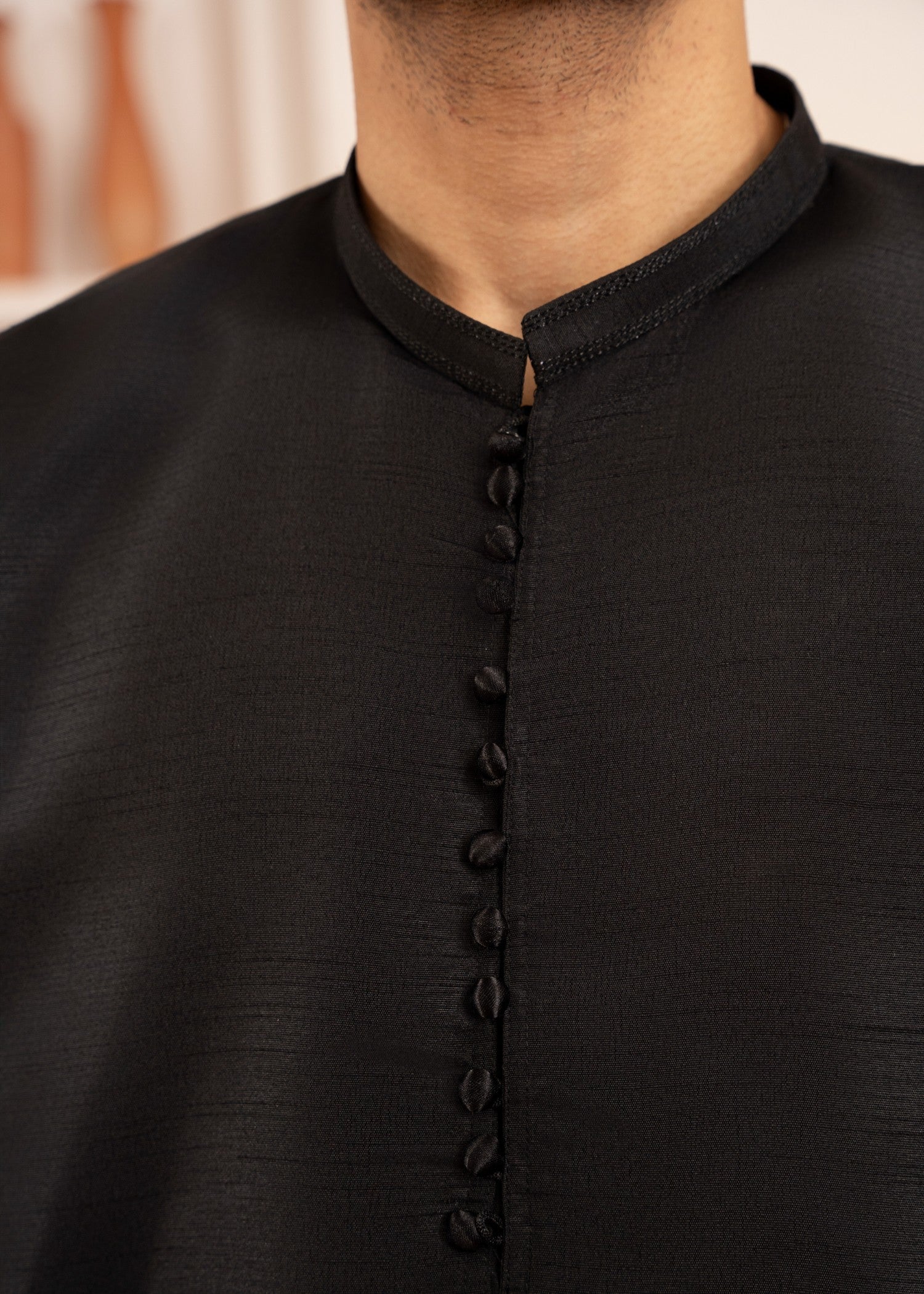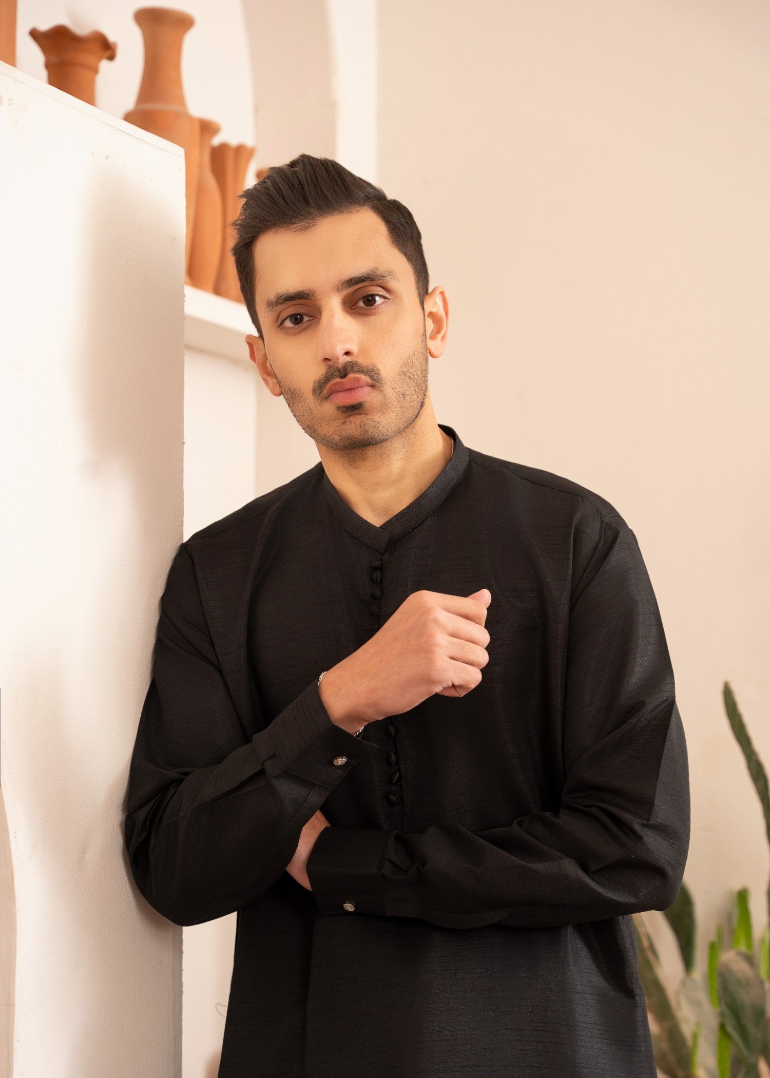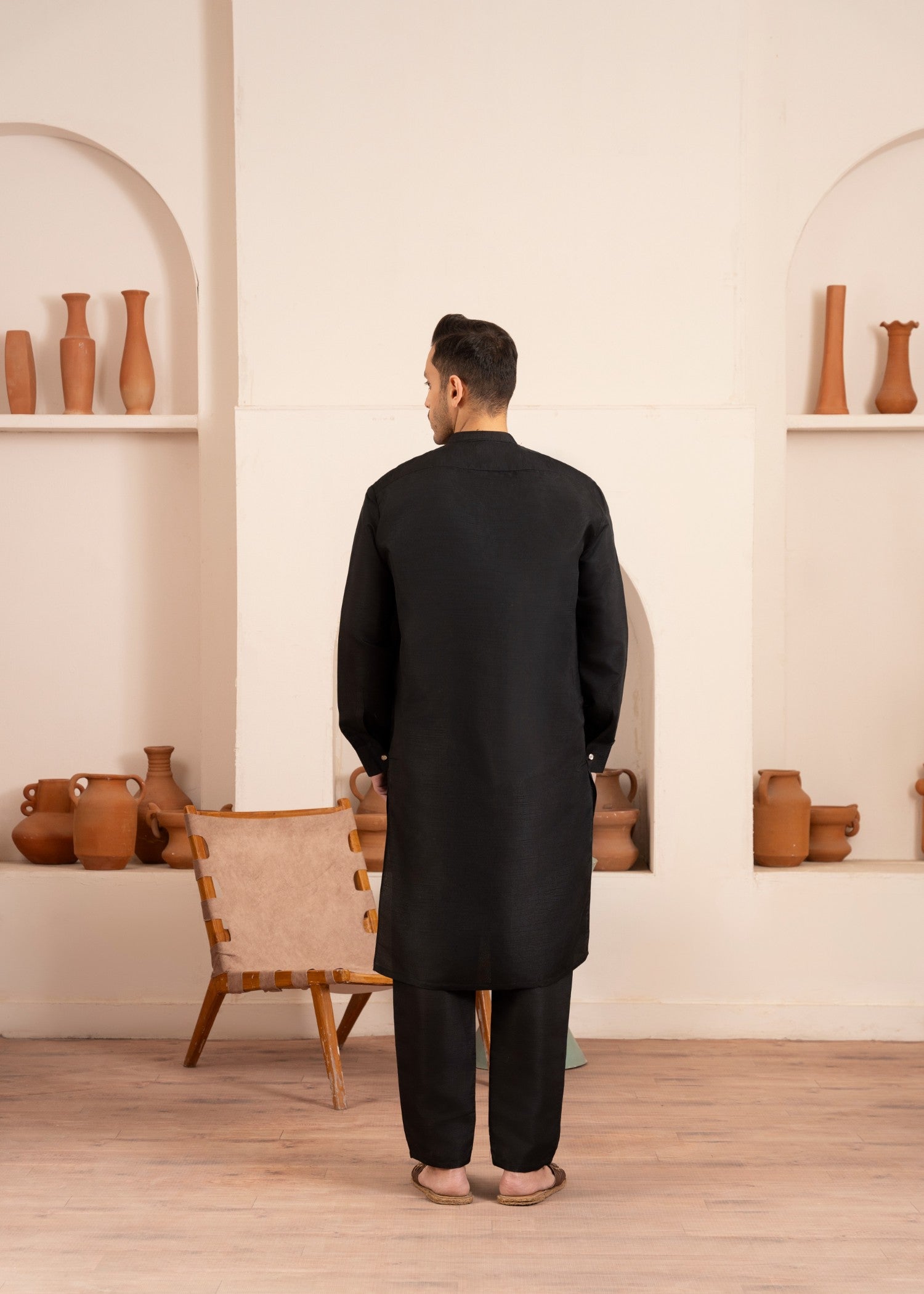 Black raw silk kurta set with a mandarin collar top and straight trouser bottom—perfect for festive occasions, parties, and all-season elegant traditional menswear styling.