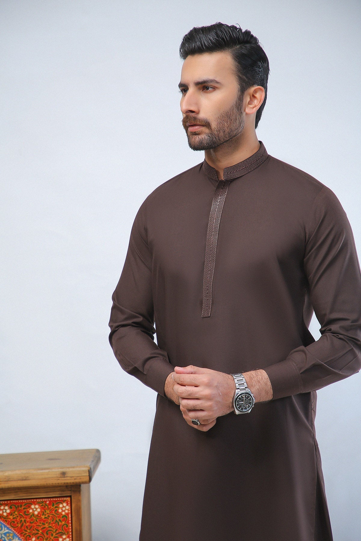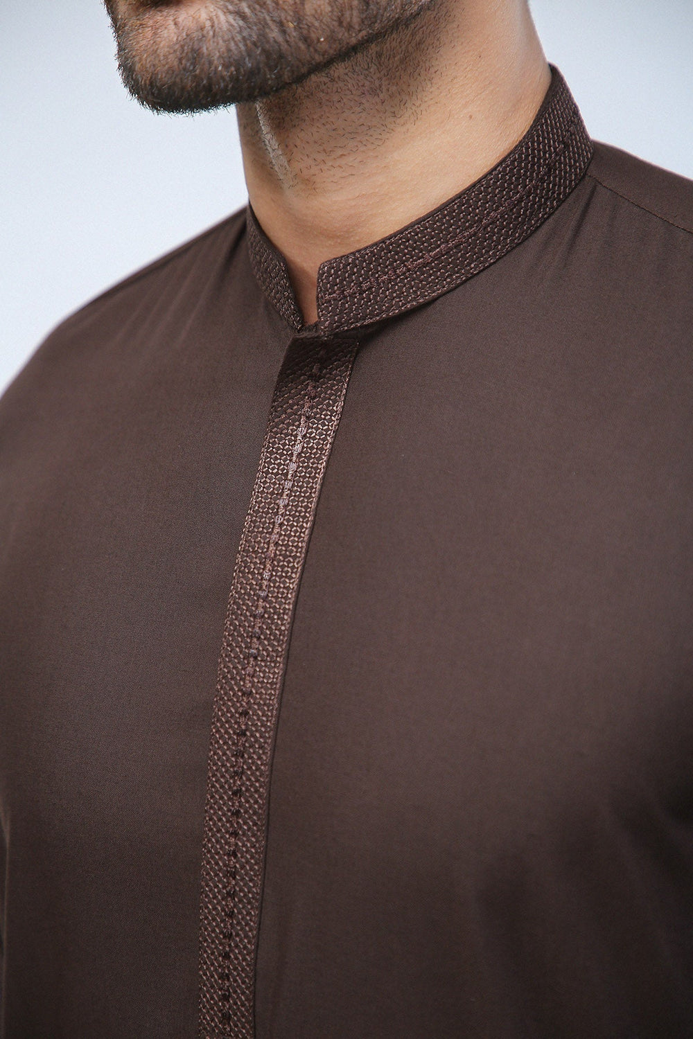 Brown embroidered shalwar kameez in premium wash-and-wear fabric, featuring a mandarin collar and straight-leg bottom—perfect for festive occasions, party wear, and all-season elegant traditional menswear.