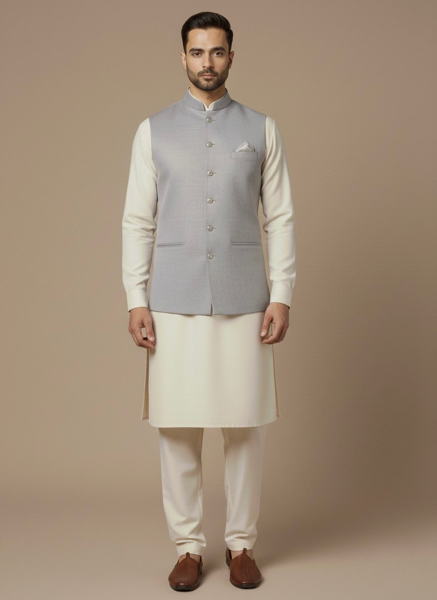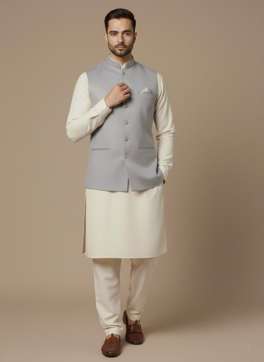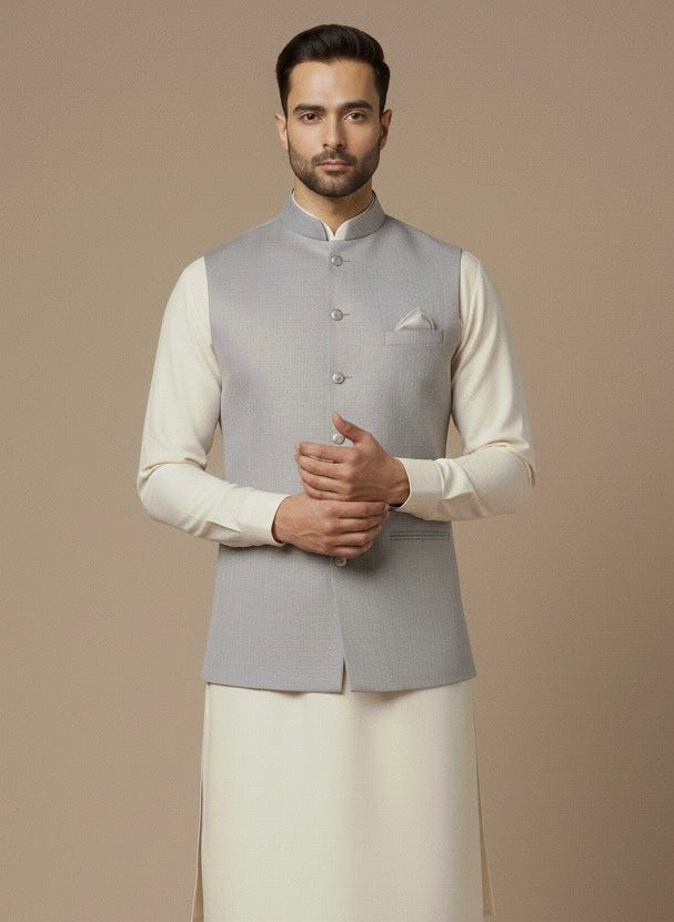 Enhance your refined style with this light grey plain waistcoat, crafted from premium fabric with a tailored fit—ideal for weddings, festive occasions, office wear, and elegant daily menswear looks.