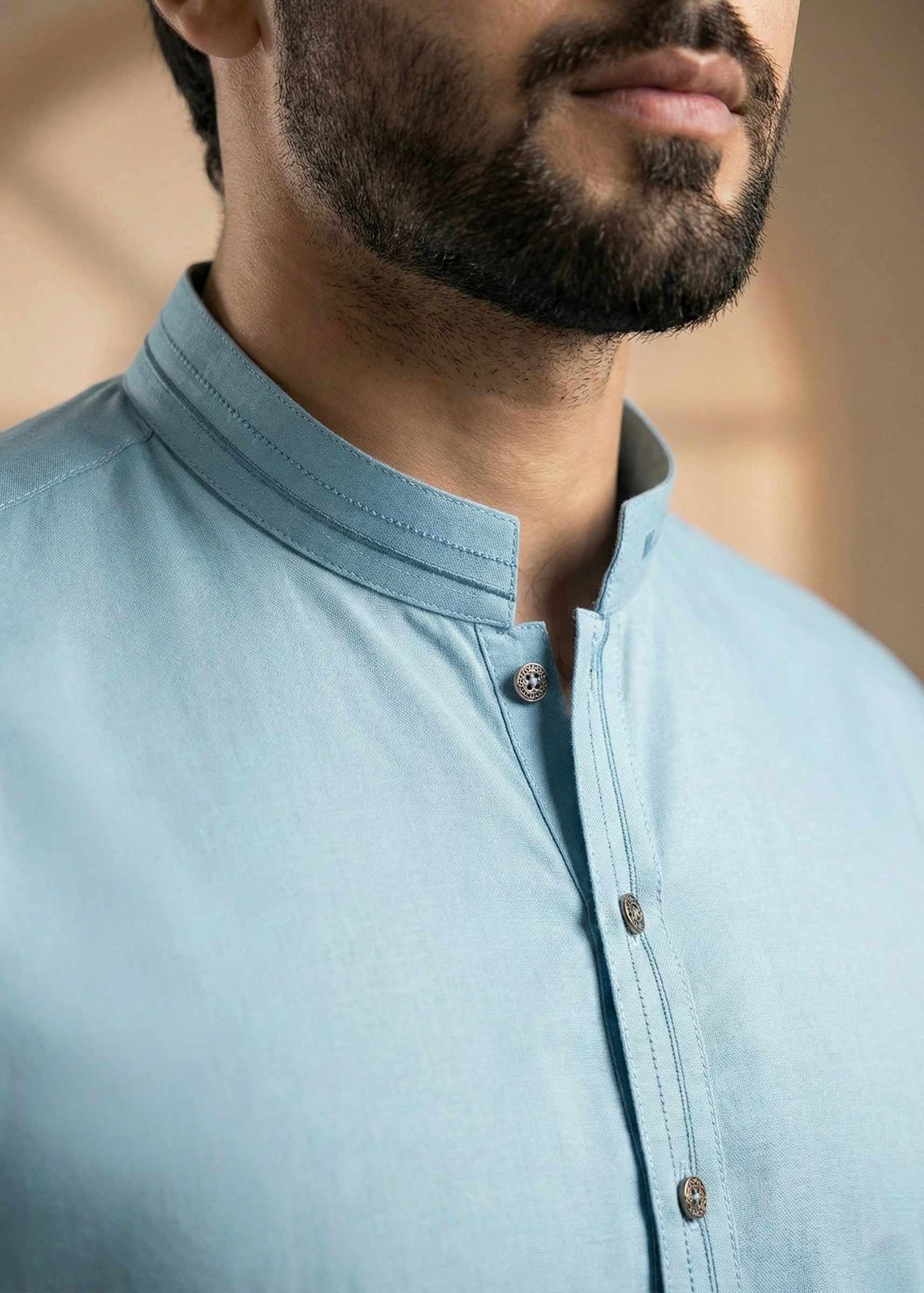Elegant two-piece shalwar kameez in sky blue wash & wear fabric. Features a sophisticated band collar design for a refined look. Perfect for casual and semi-formal occasions with effortless maintenance.
