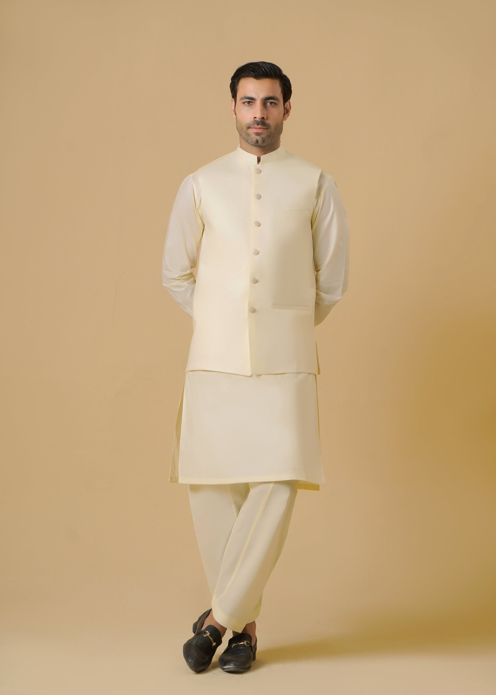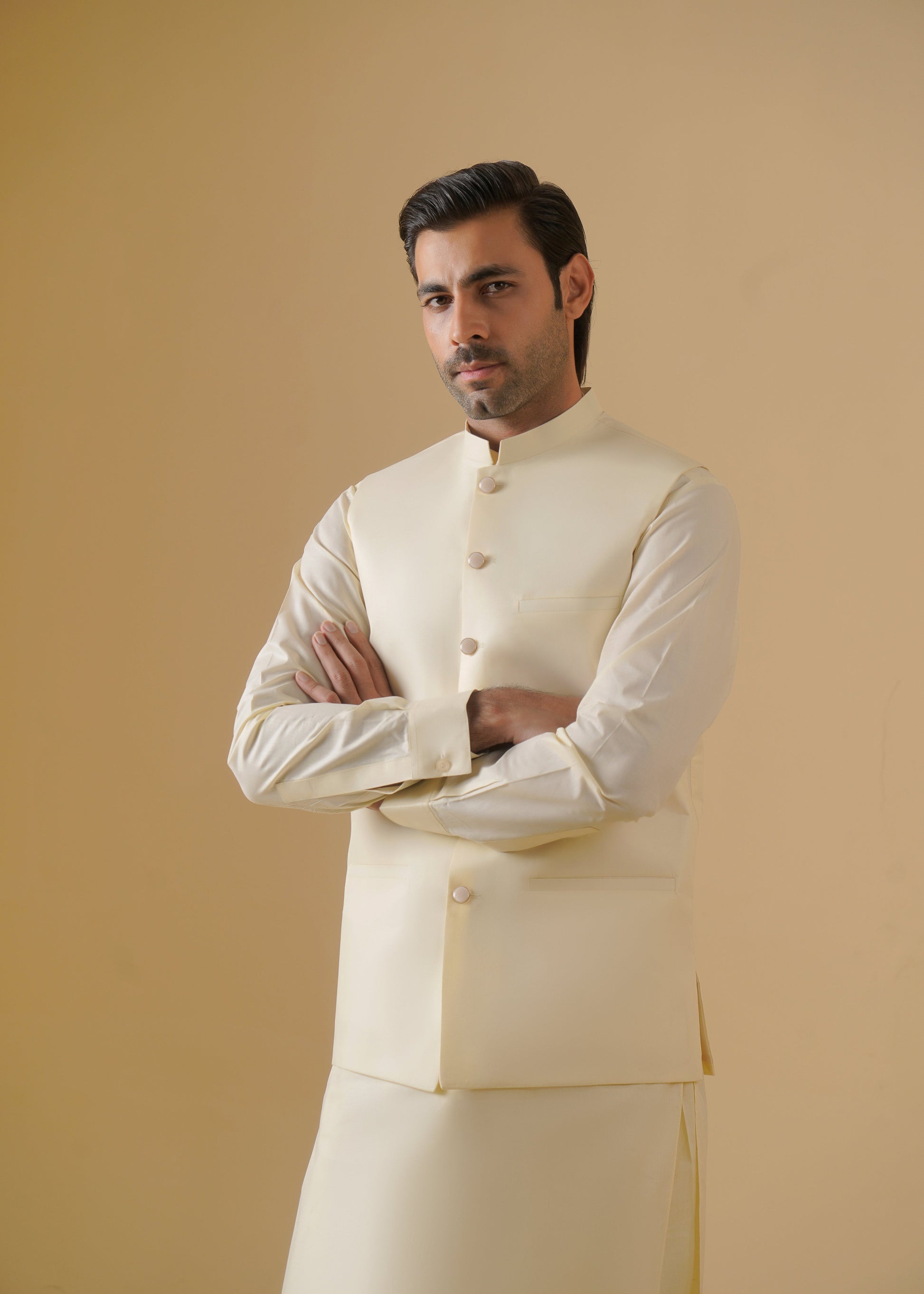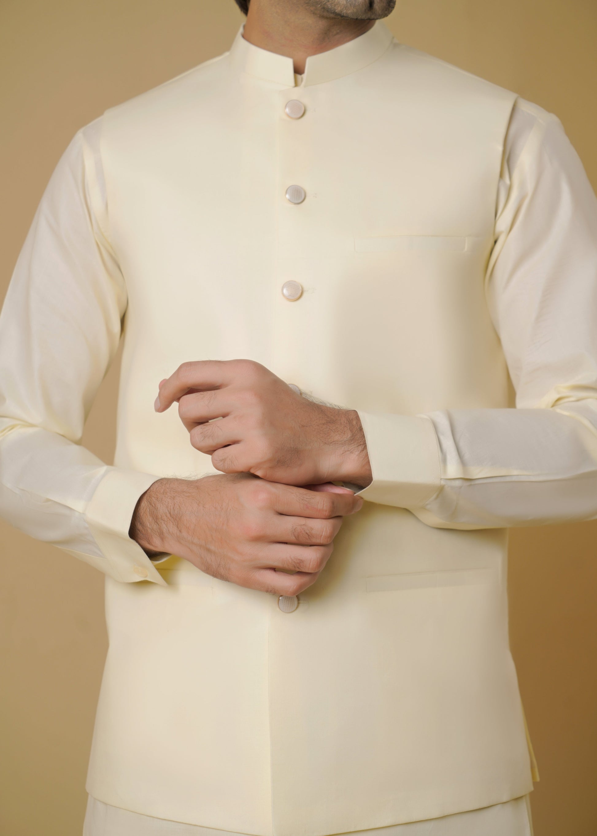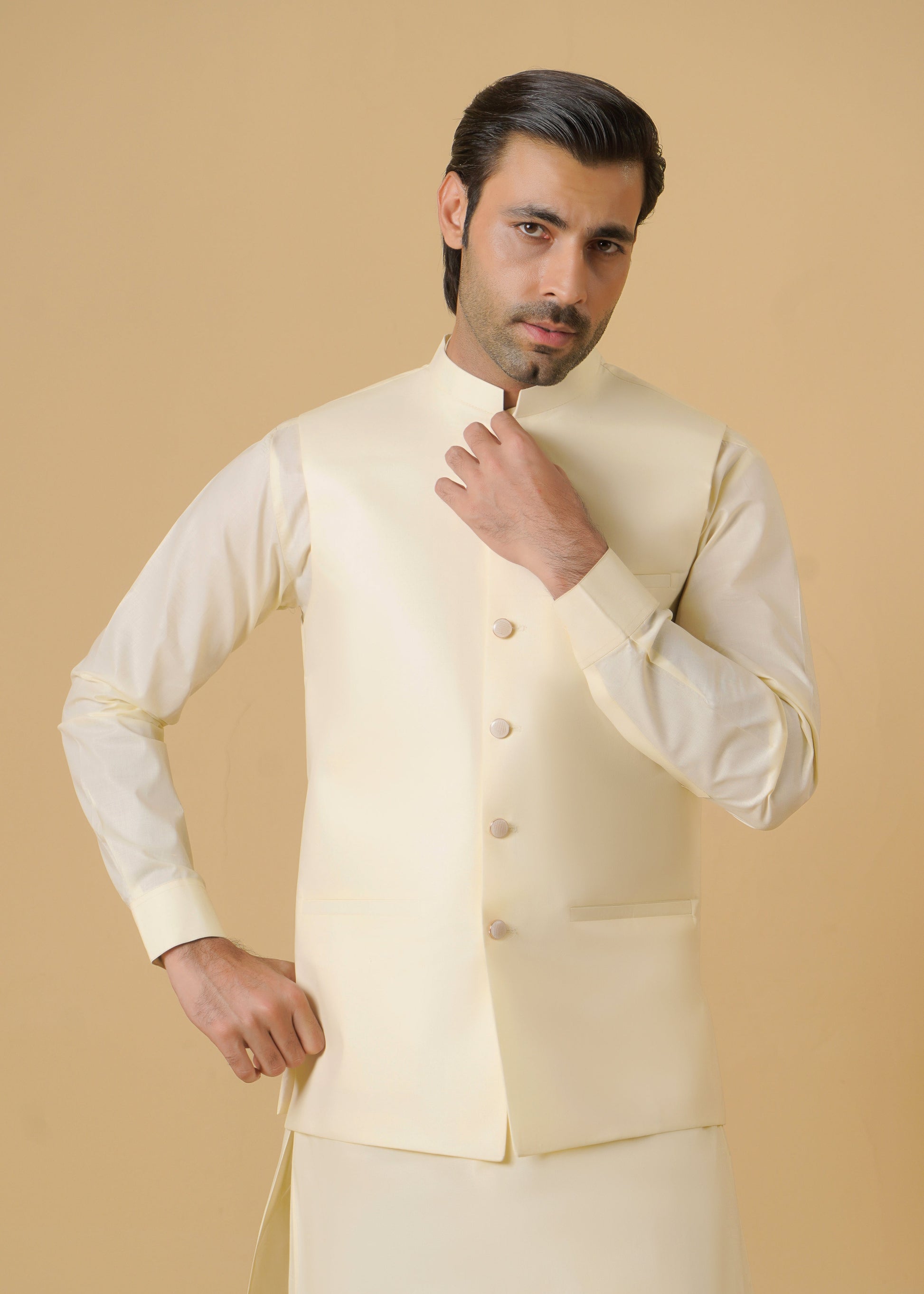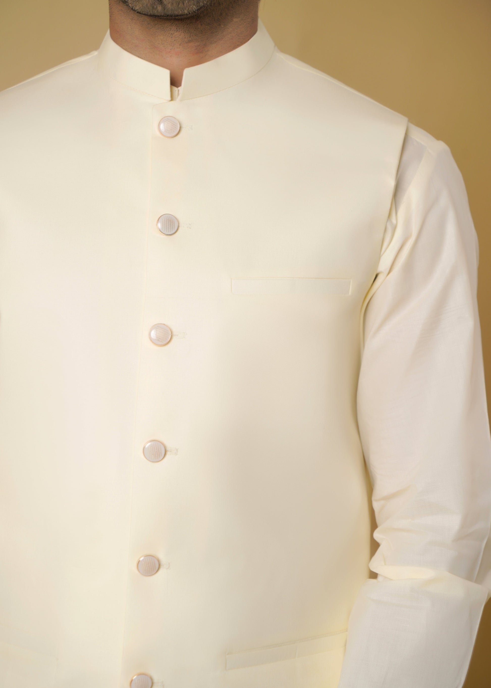 Elegant cream cotton outerwear Waistcoat piece designed for summer festivities. Regular fit silhouette offers comfortable styling for parties and celebrations. Breathable fabric ensures all-day wearability during warm-weather occasions.