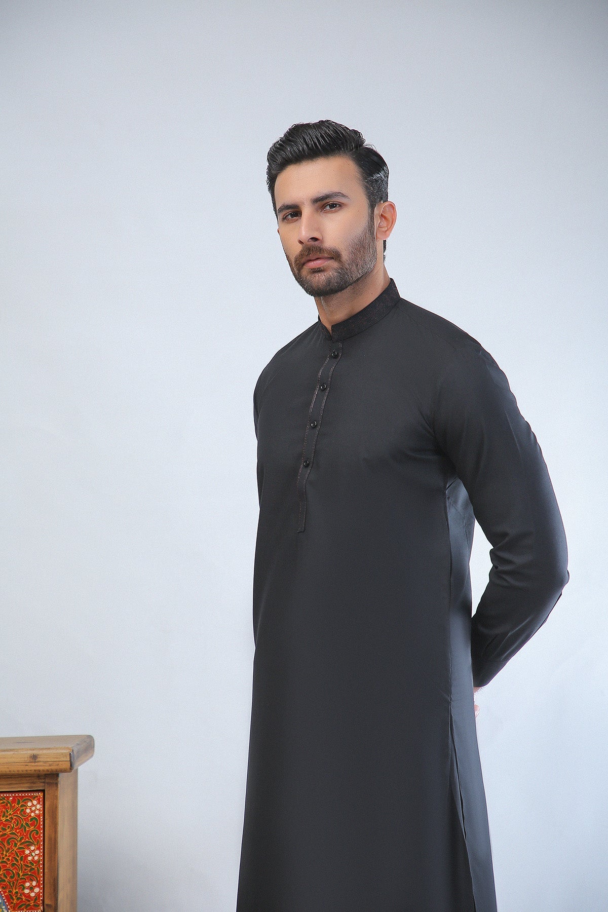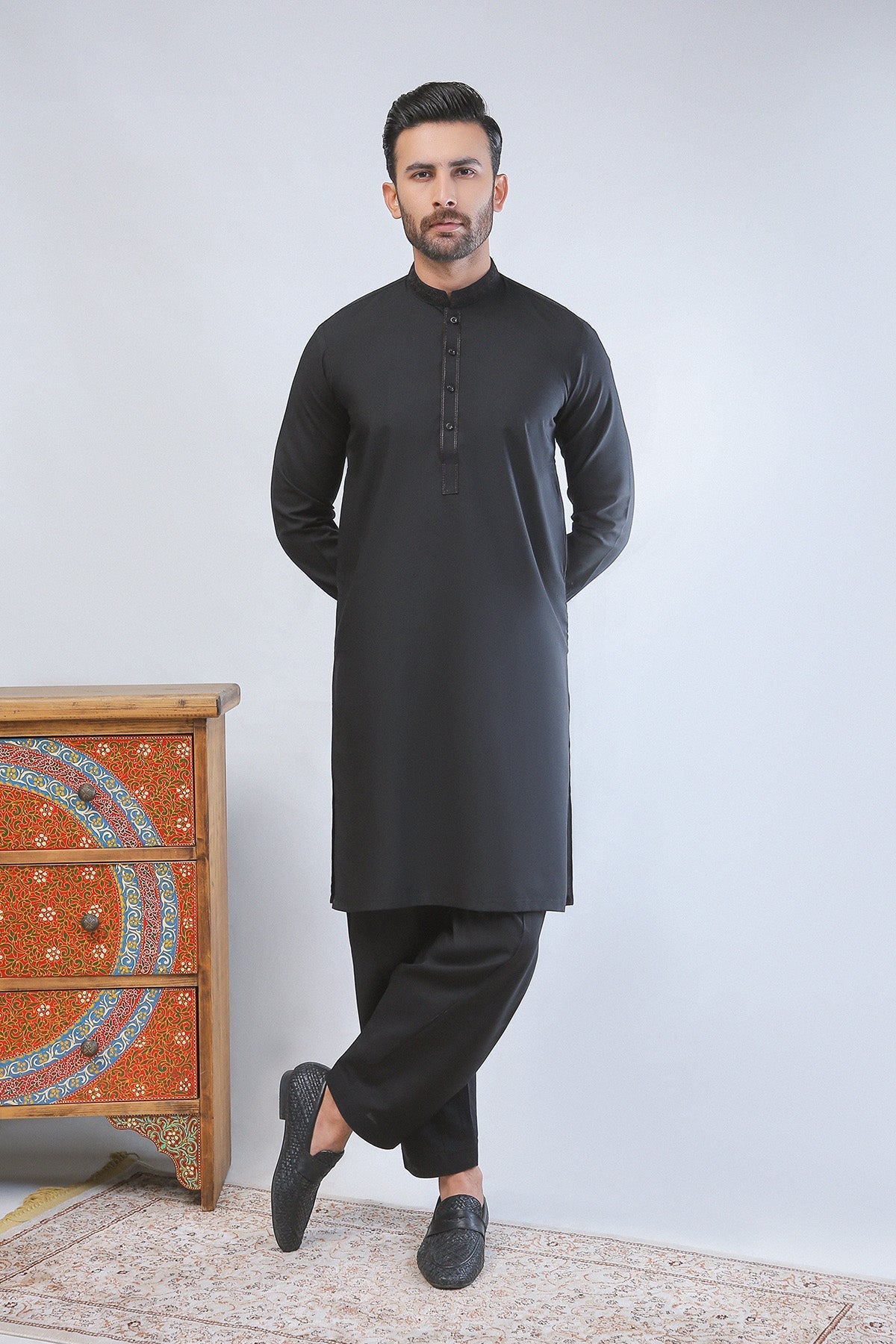 Black embroidered shalwar kameez in premium wash-and-wear fabric, designed with a mandarin collar and straight-leg bottom—perfect for festive occasions, party wear, and timeless all-season menswear elegance.