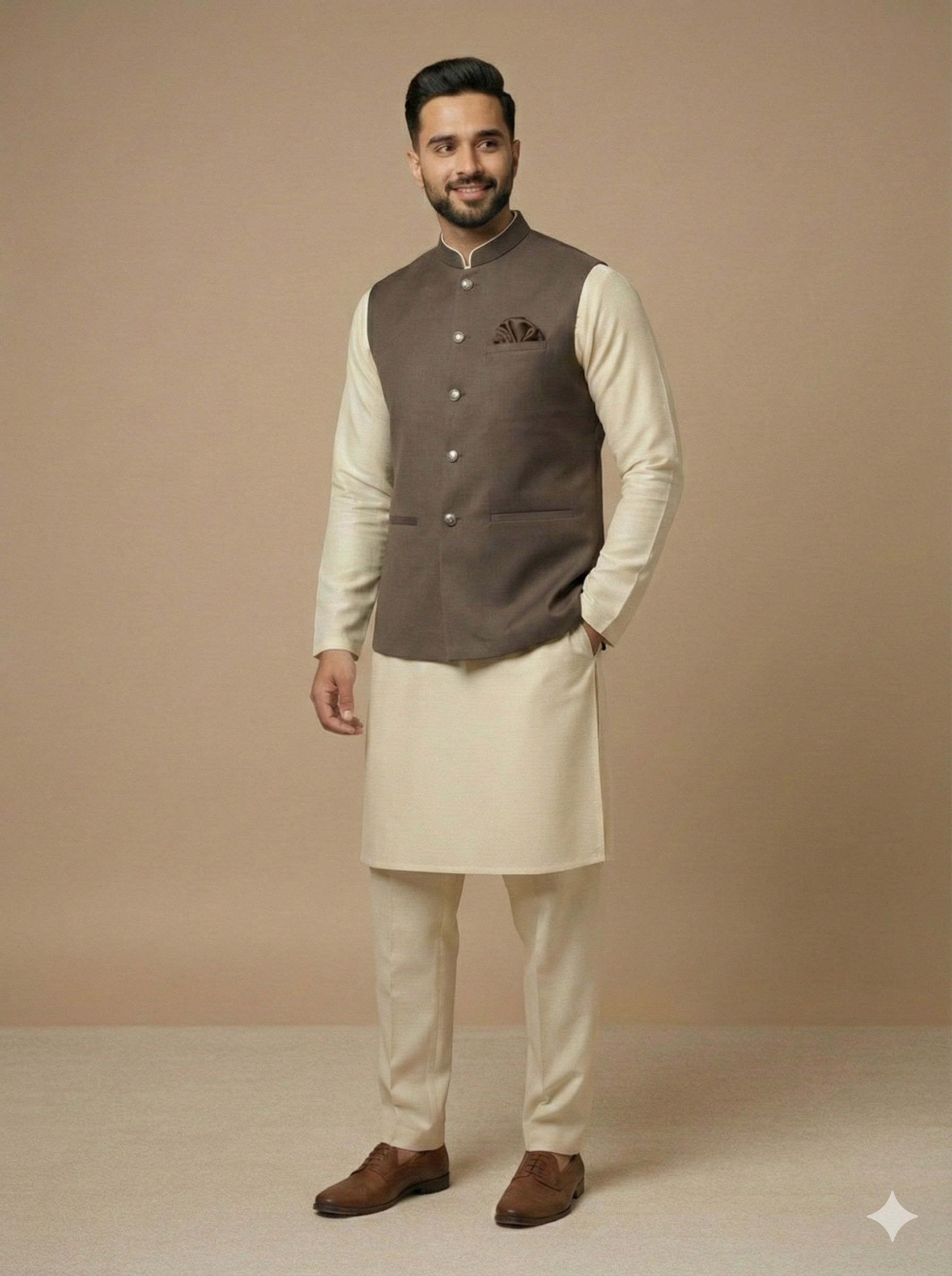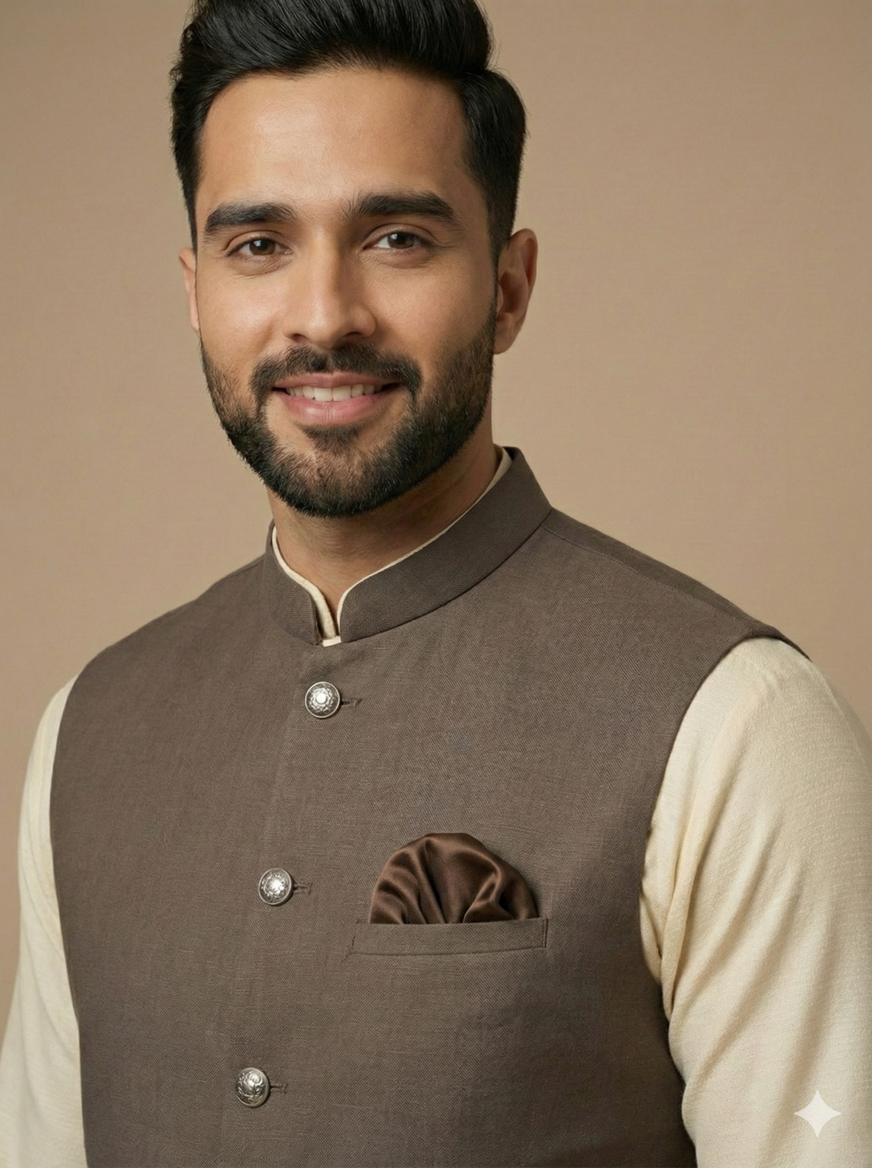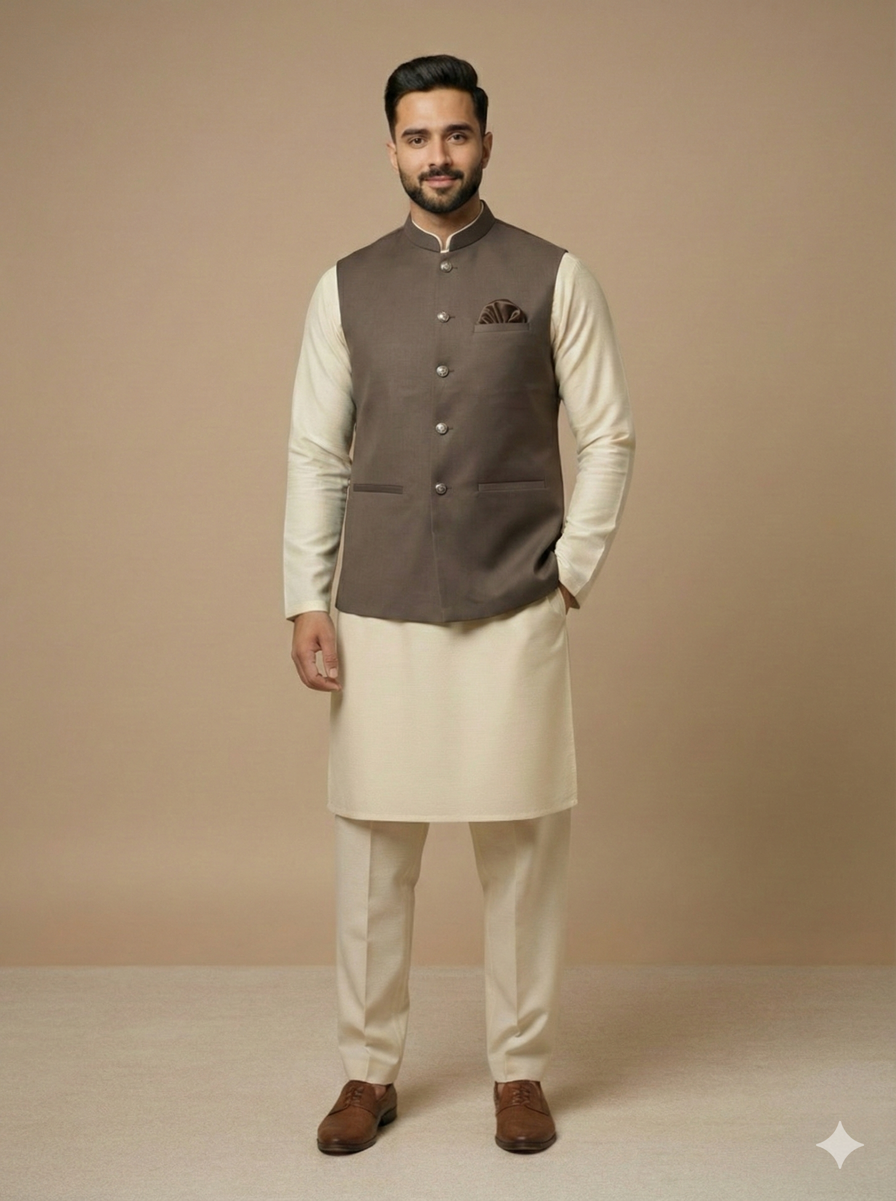Enhance your formal wardrobe with this beige brown plain waistcoat, crafted from premium fabric with a tailored fit—perfect for weddings, festive occasions, office wear, and elegant daily menswear styling.