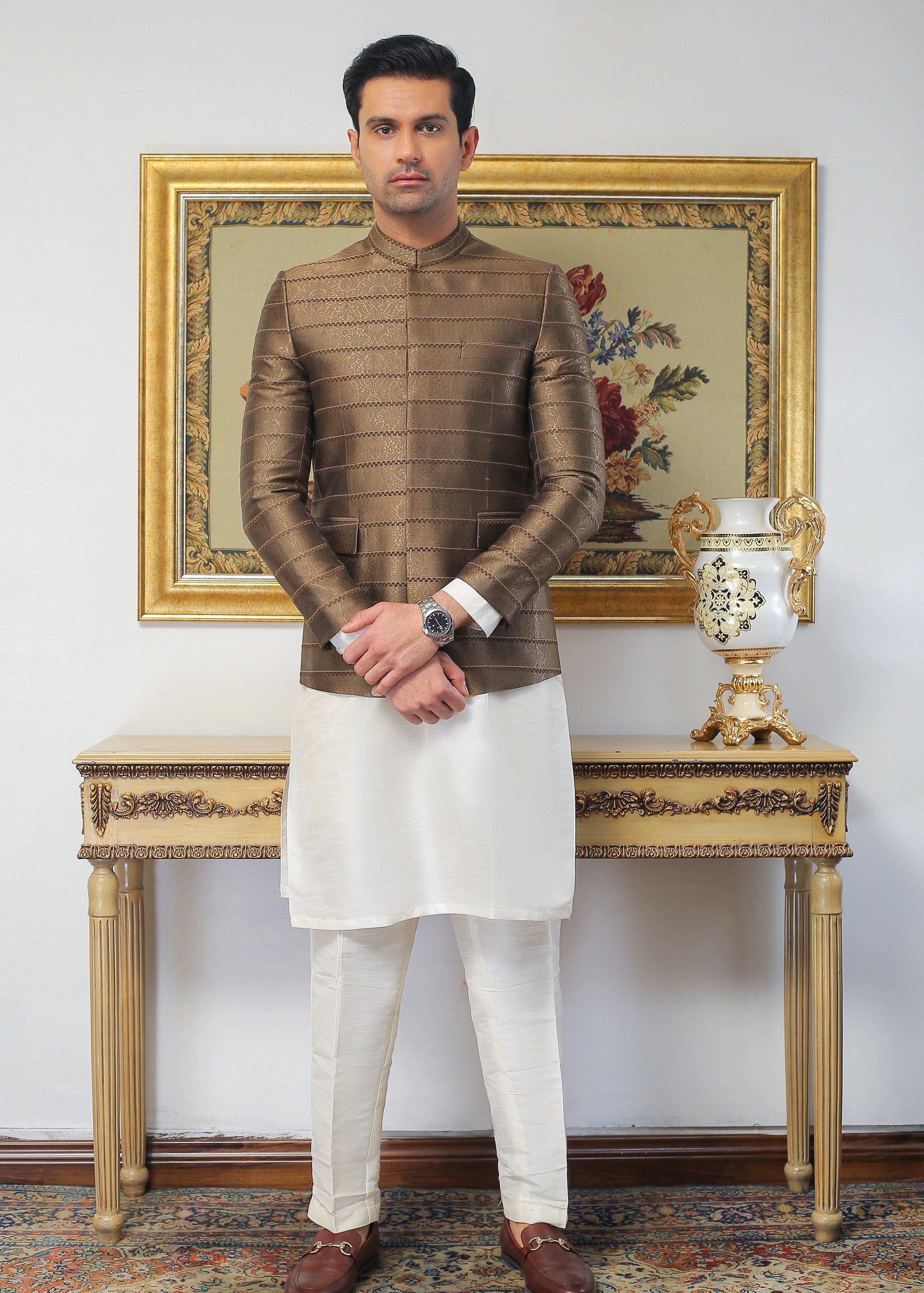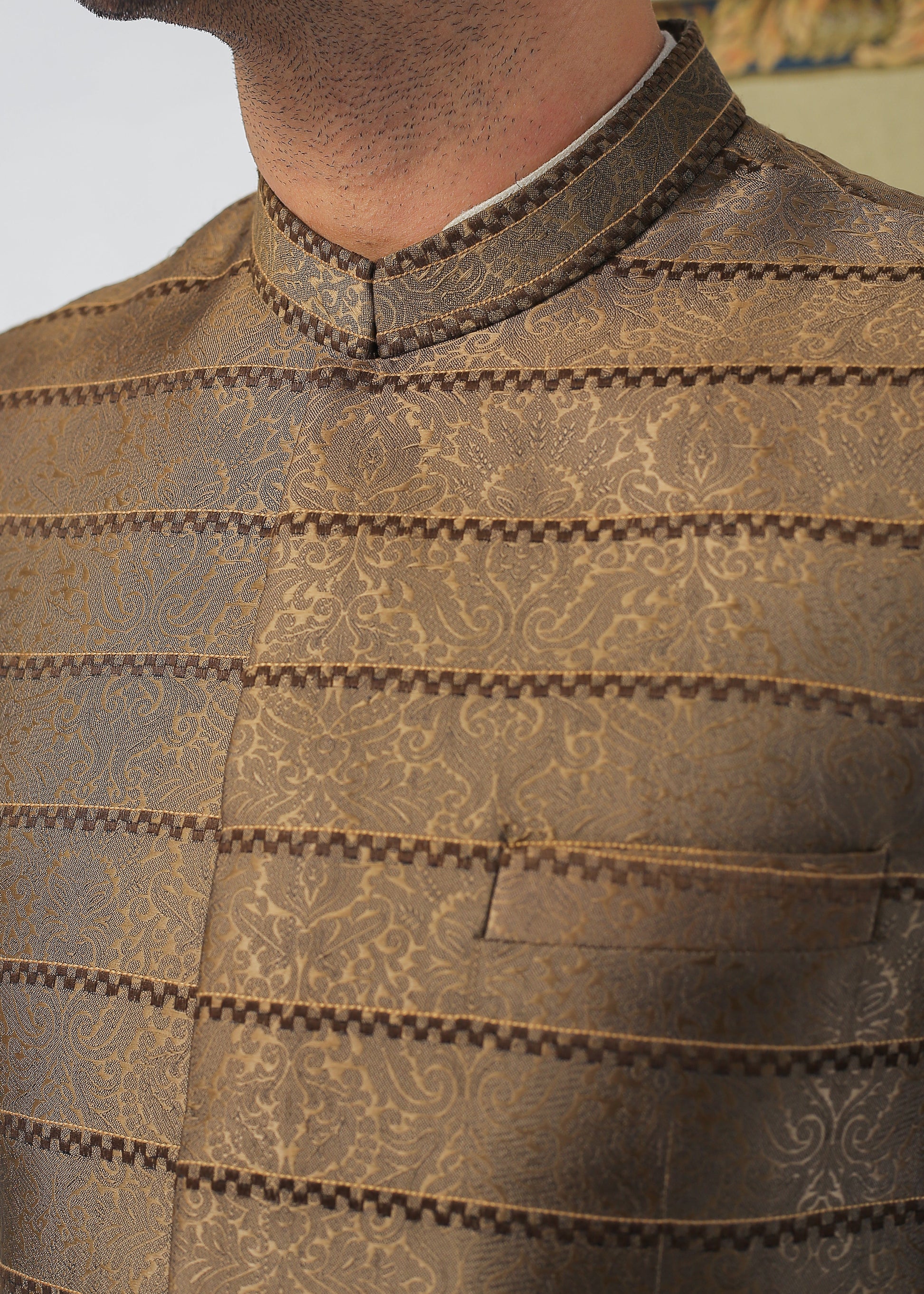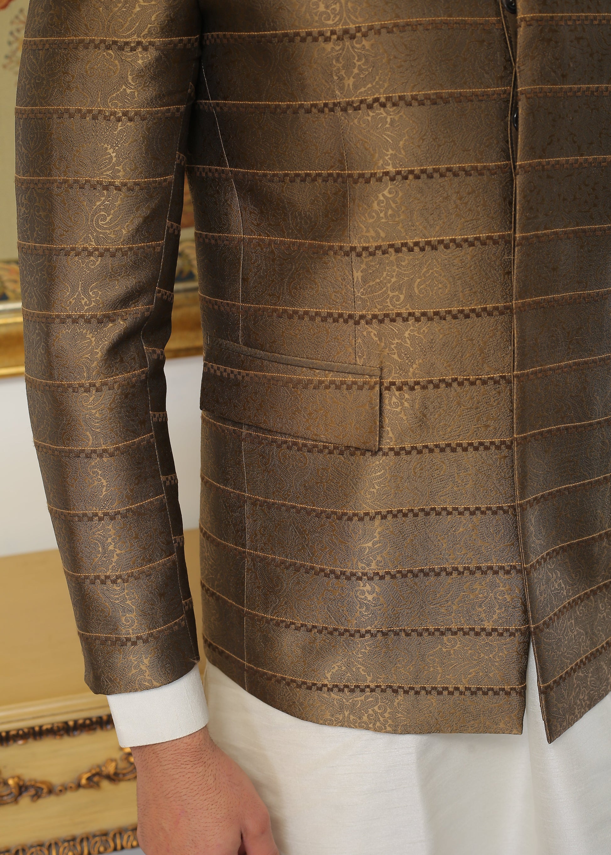 Exquisite Prince Coat crafted from premium Jamawar fabric in rich brown. This sophisticated garment showcases traditional artistry with refined tailoring, perfect for formal occasions and cultural celebrations.