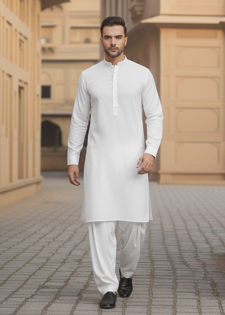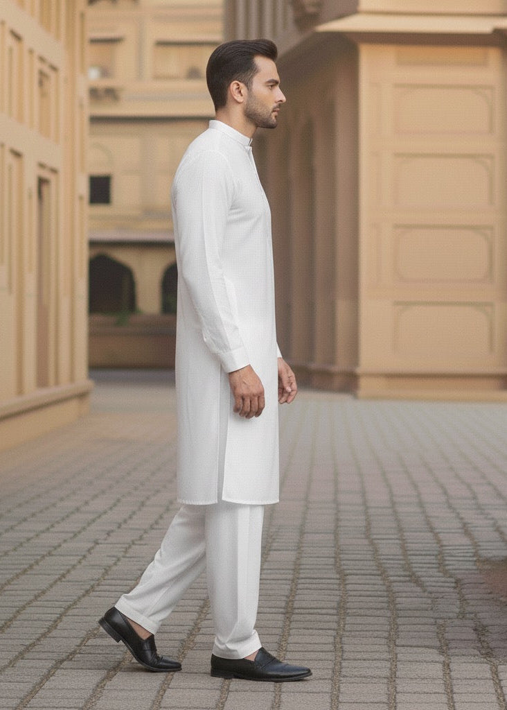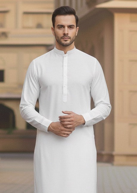 Elevate your classic look with this white shalwar kameez, crafted from premium fabric with a tailored fit—perfect for weddings, festive occasions, formal gatherings, and refined daily menswear wear.