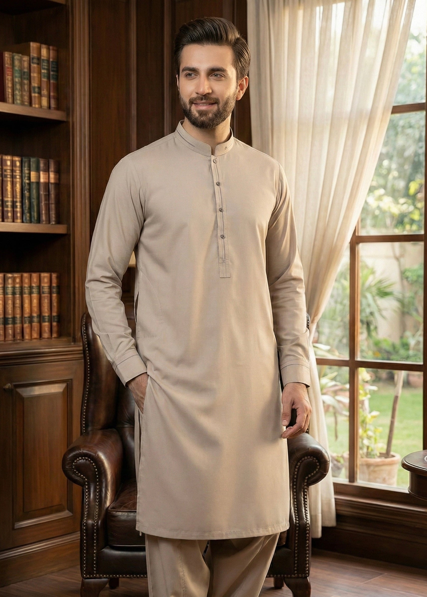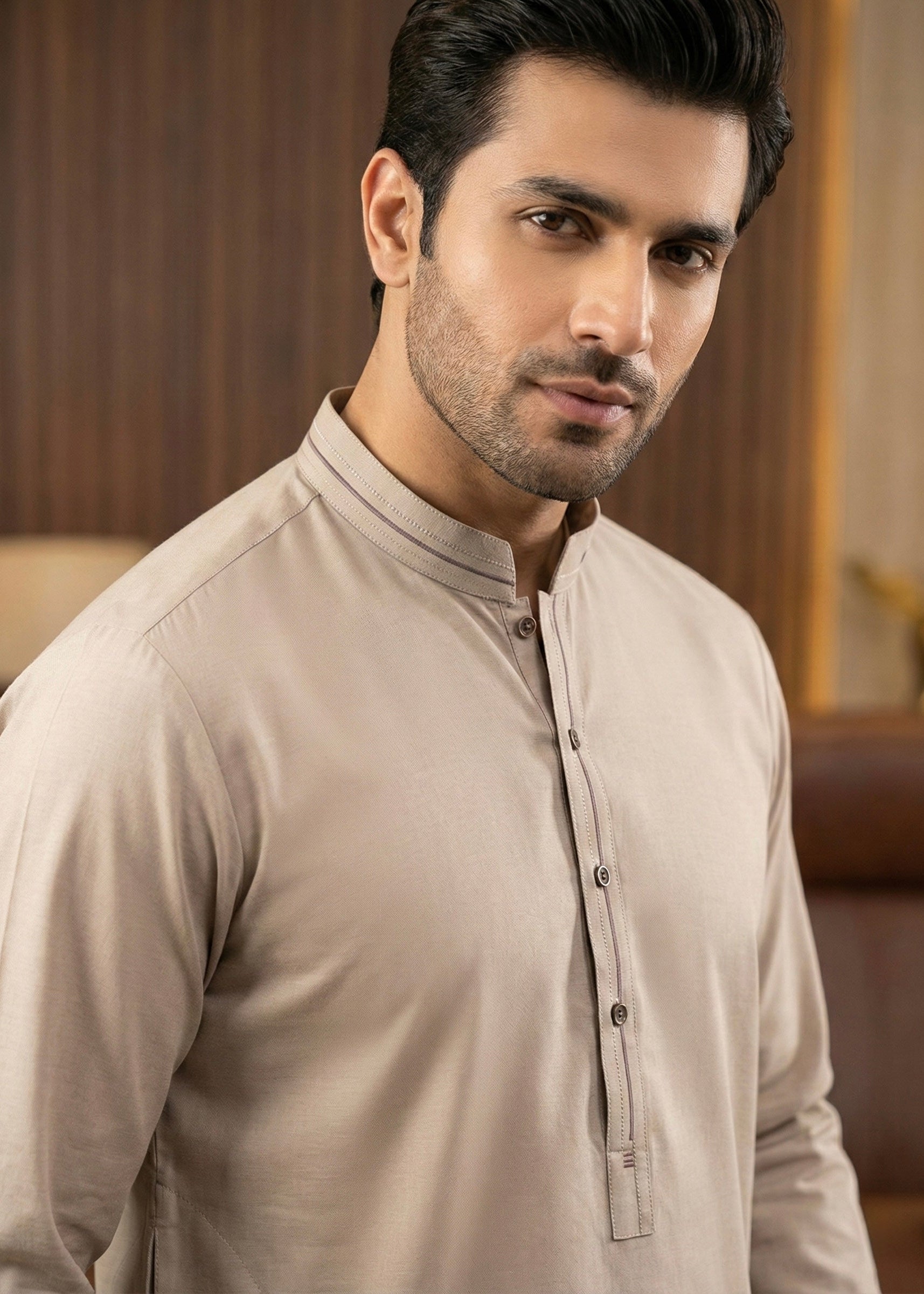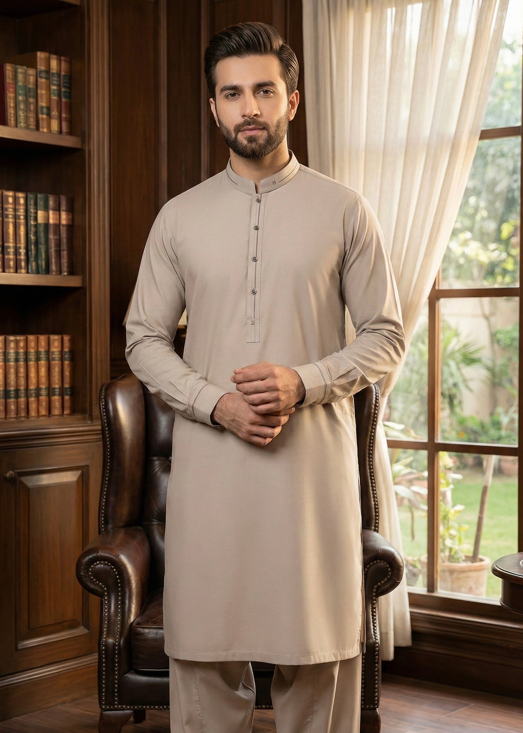 Elegant two-piece Wash & Wear shalwar kameez in soft light tea pink. Features a sophisticated band collar design with premium fabric that's easy to maintain and perfect for everyday wear.