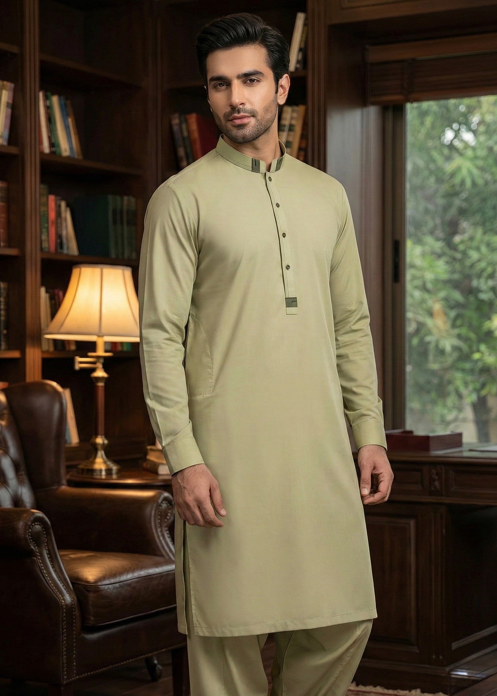 Elegant two-piece Shalwar Kameez in light pista featuring a sophisticated band collar design. Crafted from premium wash and wear fabric for effortless maintenance and lasting comfort throughout your day.