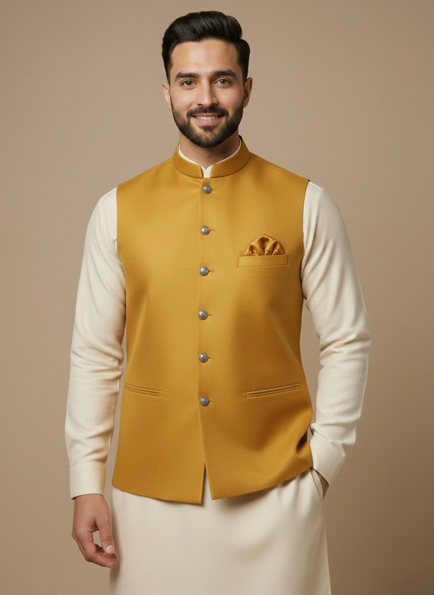 Refresh your festive wardrobe with this mustard yellow plain waistcoat, tailored in premium fabric with a sleek fit—perfect for weddings, traditional occasions, and refined formal menswear styling.
