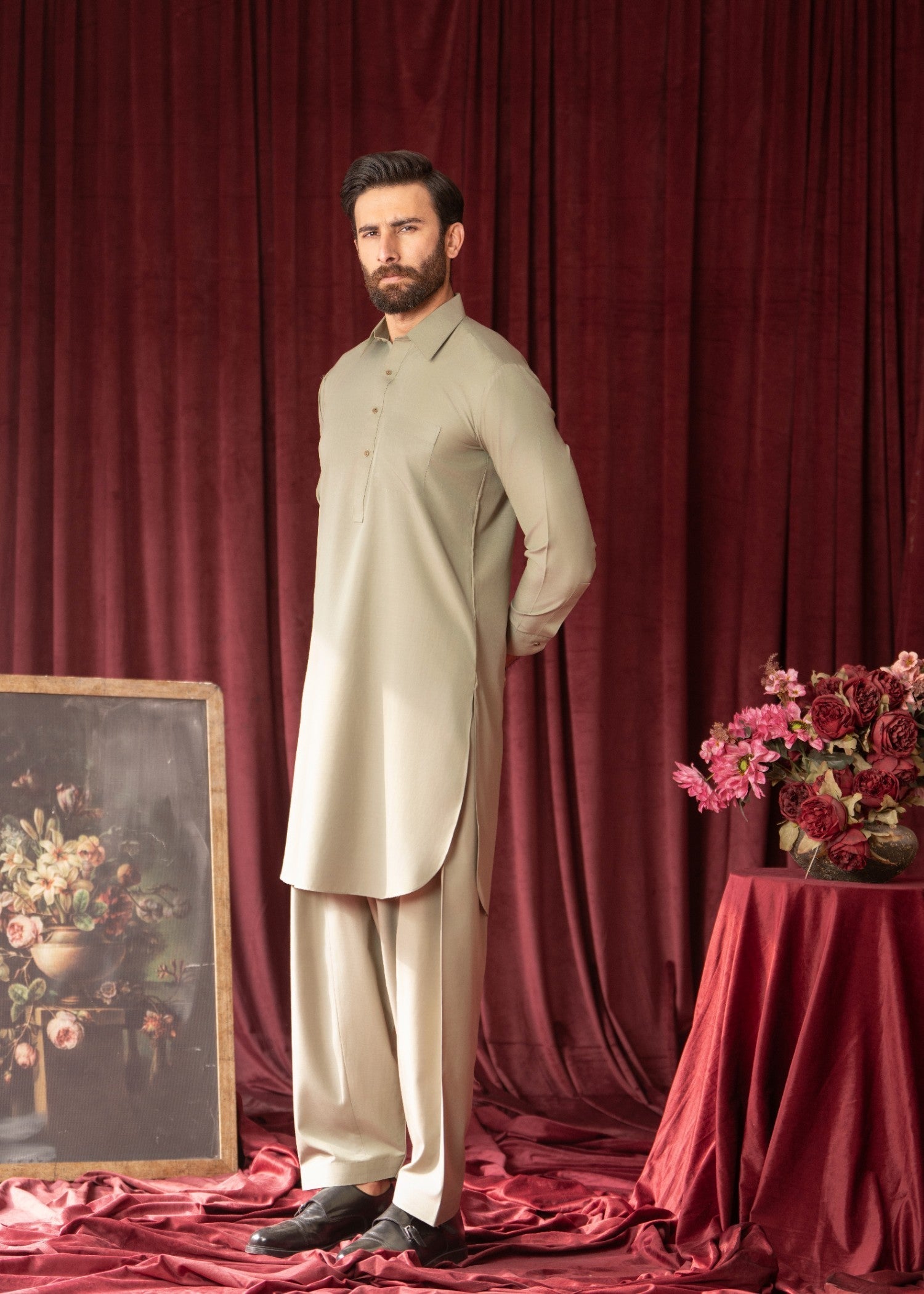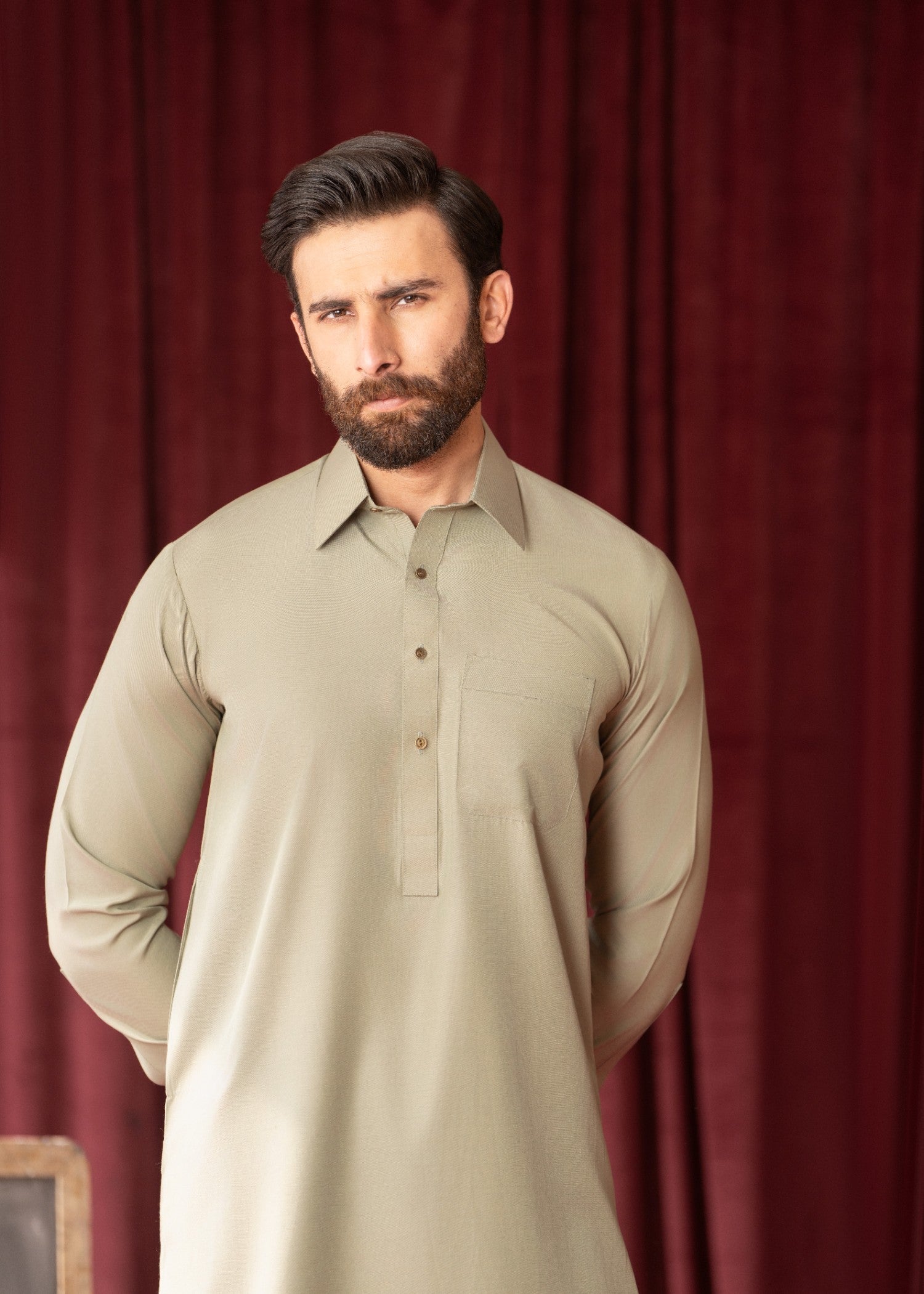 Olive green wash-and-wear shalwar kameez with a straight-cut top and straight-leg bottom perfect for everyday wear, all-season comfort, and versatile modern traditional menswear style.