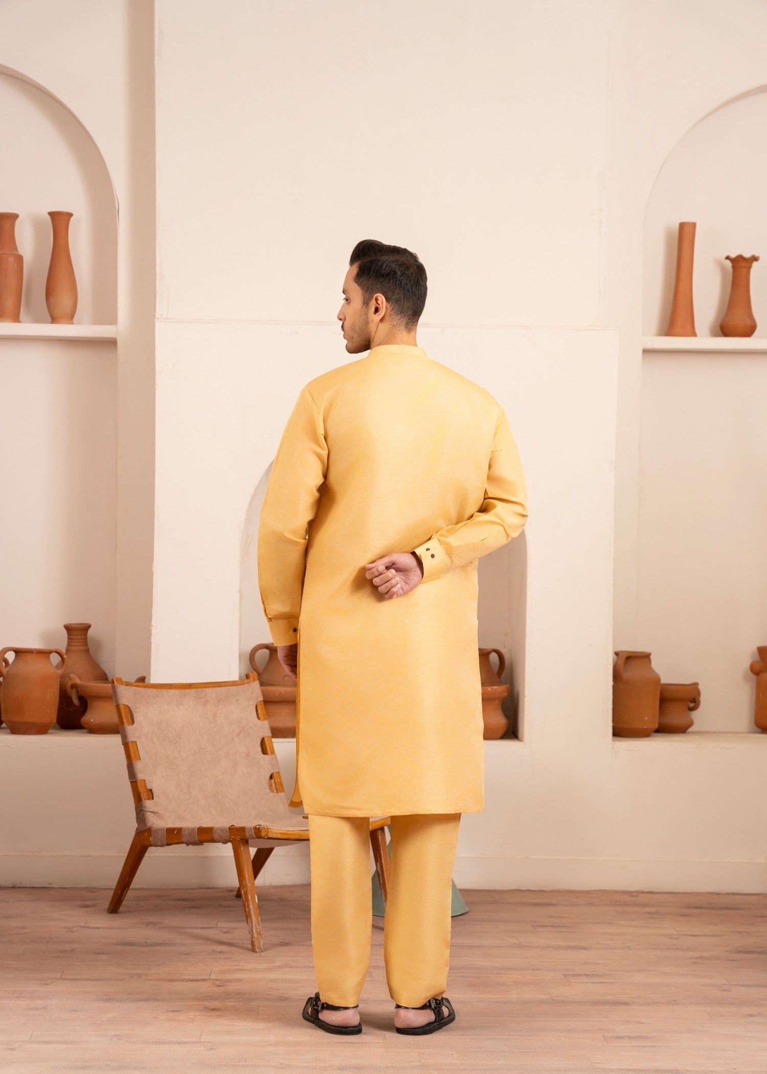 Yellow raw silk kurta set with a straight-cut top and straight trouser bottom—perfect for festive occasions, parties, and all-season vibrant traditional menswear styling.